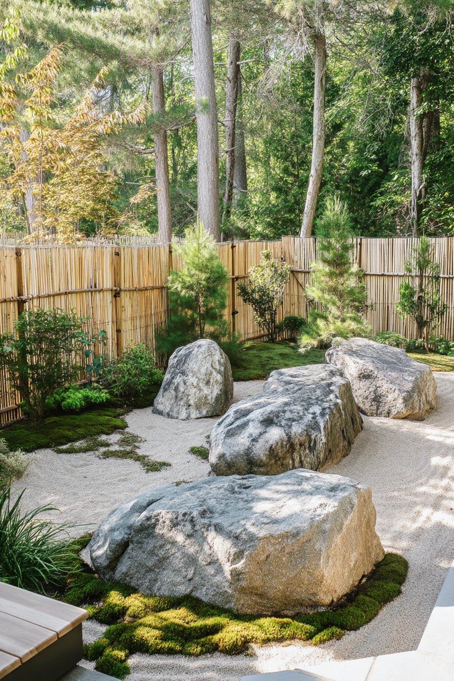A serene design featuring large boulders surrounded by soft, lush moss creates a peaceful atmosphere, perfect for meditation. To replicate this look, incorporate low-maintenance plants like dwarf conifers and use gravel or sand for a minimalist ground cover.