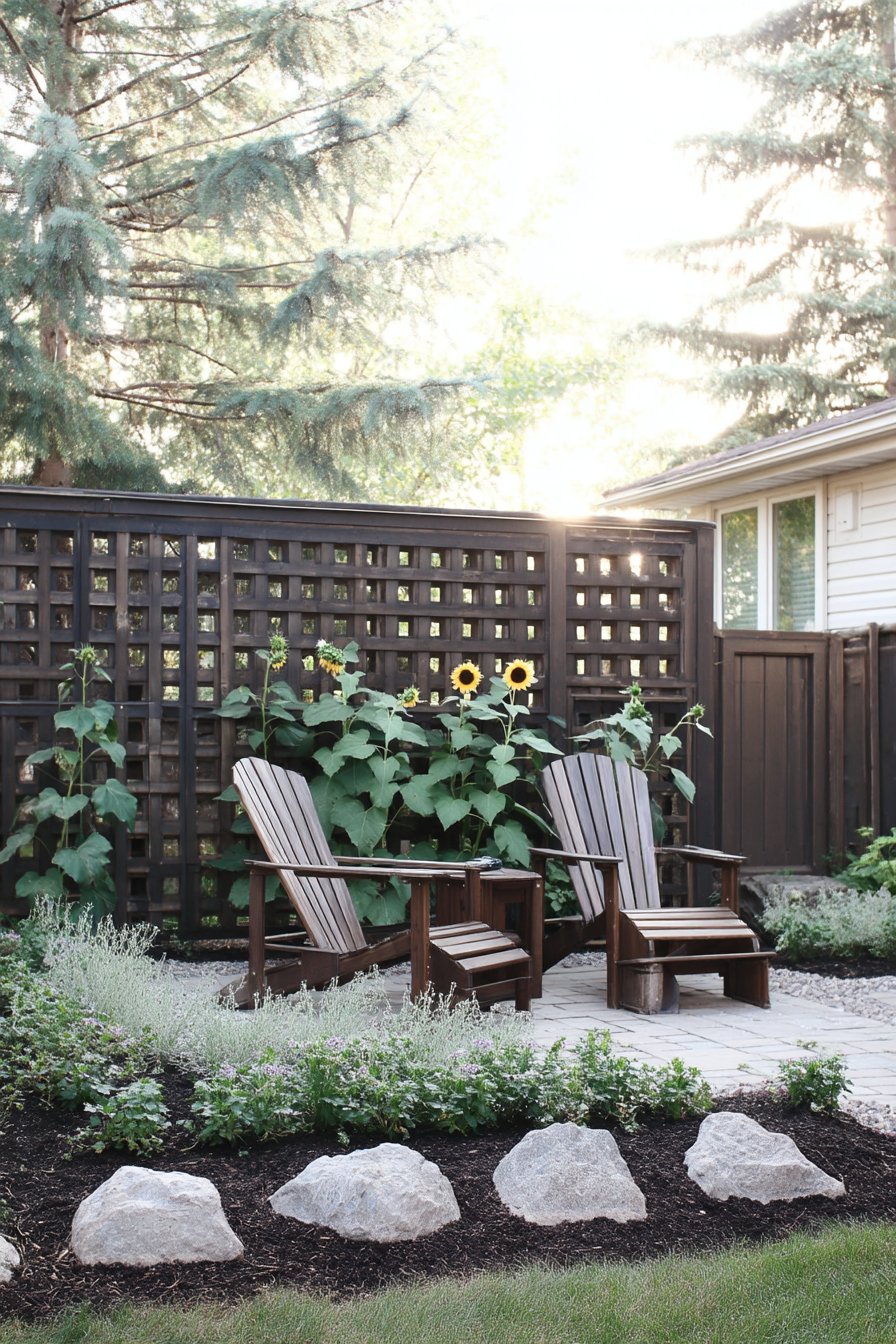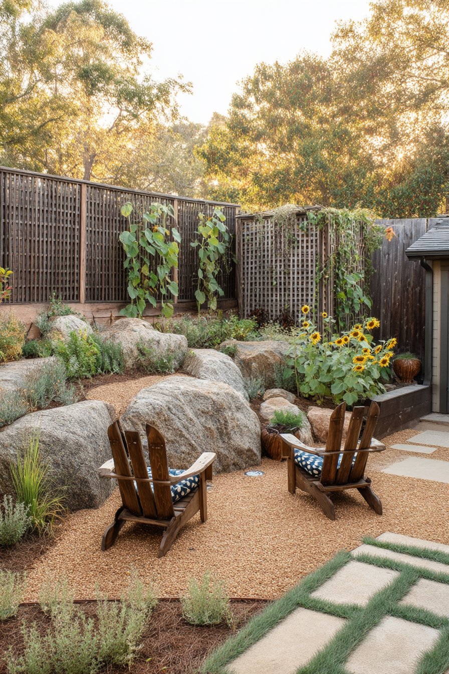 Embrace a rustic charm by integrating towering alongside cozy wooden seating and natural boulders, creating a warm, inviting atmosphere. Enhance your space with low-maintenance herbs and ground cover plants for texture and easy care.