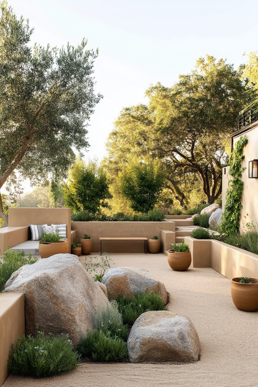 This serene garden features soft, sandy textures paired with natural boulders, creating a harmonious oasis. Incorporate drought-tolerant plants like succulents and lavender in terracotta pots for a chic, low-maintenance look.