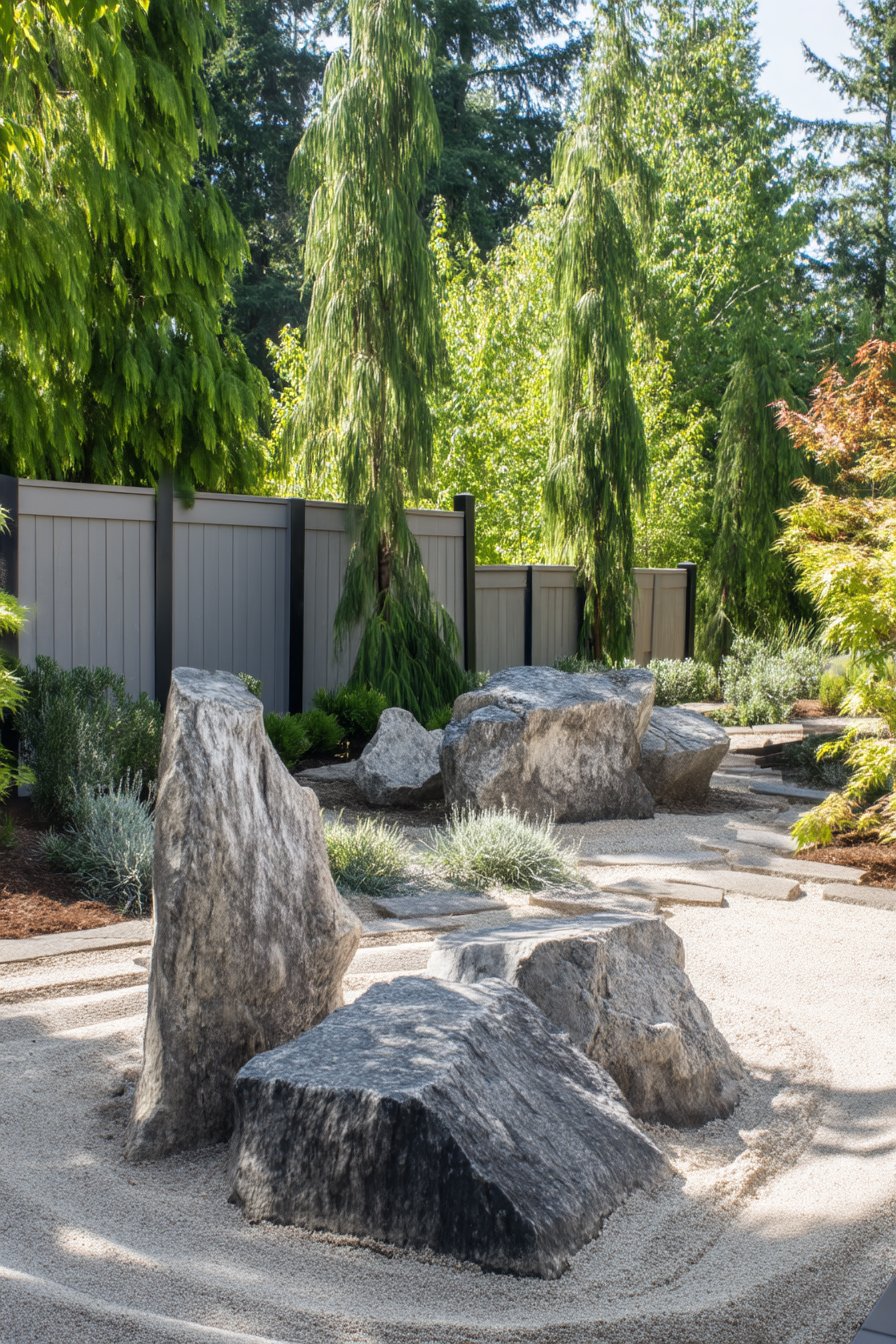 This serene garden features striking boulders, lush evergreens, and soft, textured ground cover, creating a peaceful retreat. To replicate this look, incorporate native stone, low-maintenance plants like lavender, and ensure ample gravel paths for tranquility.