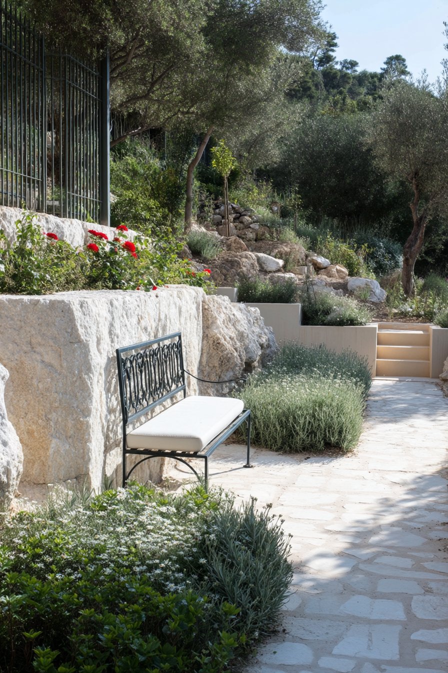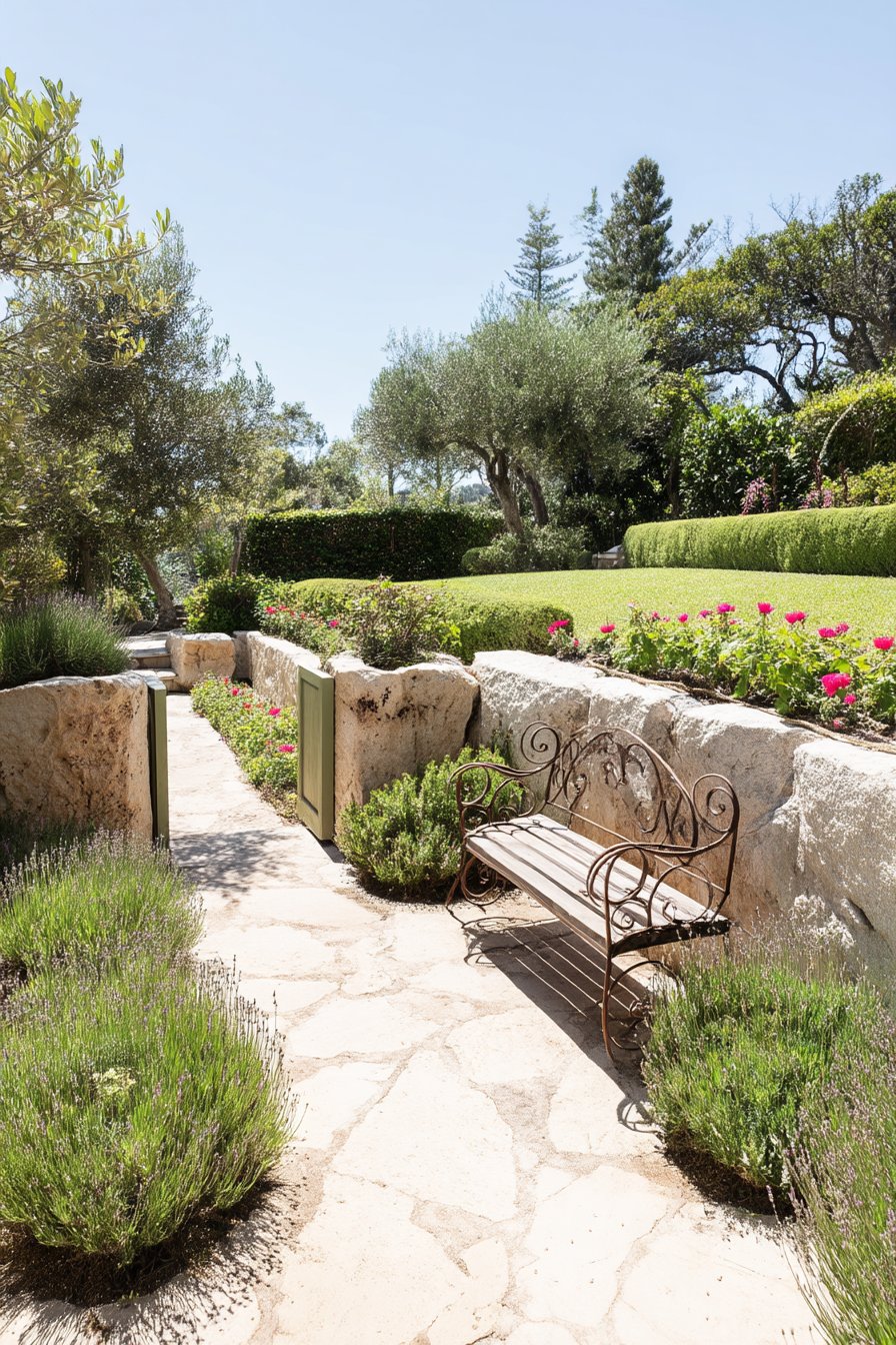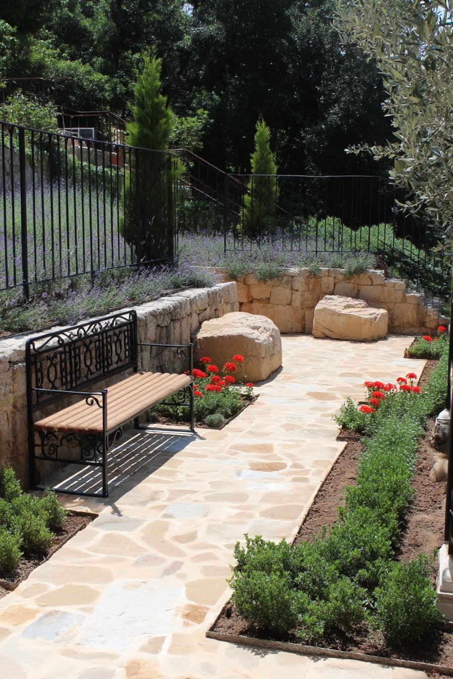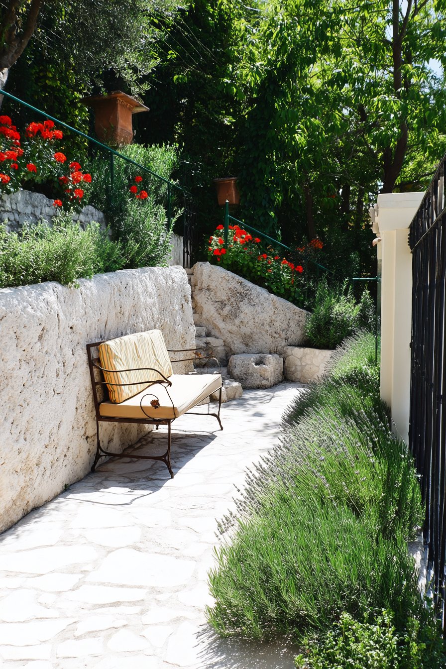 The charming stone pathway, bordered by vibrant red geraniums and fragrant lavender, creates a warm, inviting atmosphere perfect for relaxation. To replicate this look, combine rustic stone elements with drought-tolerant plants and add a cozy bench for a serene retreat.