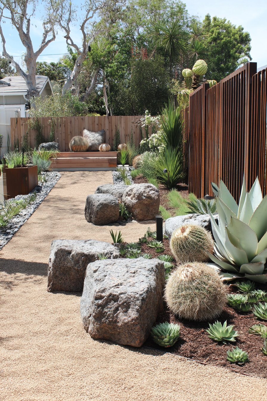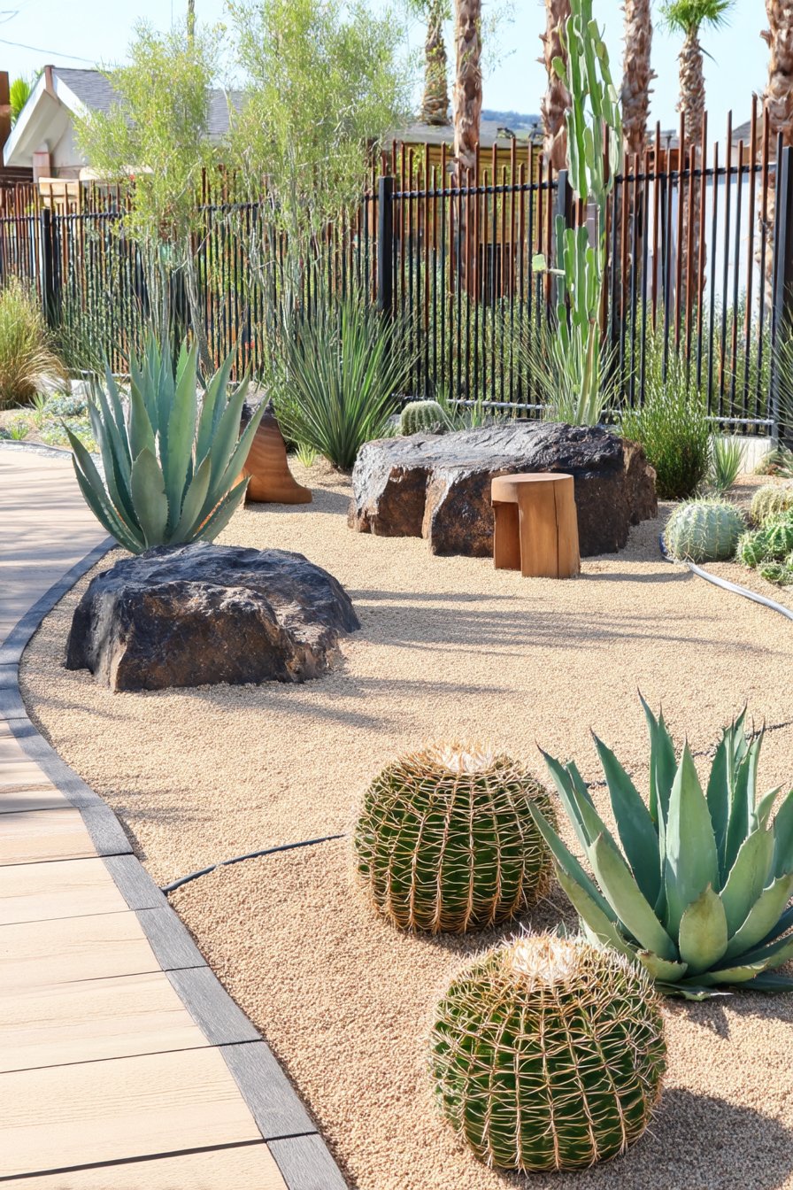 This striking garden features bold boulders and an array of vibrant cacti, creating a serene, low-maintenance oasis. To replicate this style, incorporate drought-tolerant plants like agave and barrel cacti, paired with gravel for effective drainage.