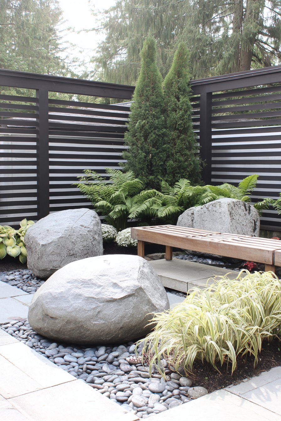 This serene garden design features large boulders and lush grasses, creating a harmonious balance between natural elements and minimalist aesthetics. To replicate this look, incorporate ornamental grasses and smooth pebbles, ensuring a tranquil space for relaxation.