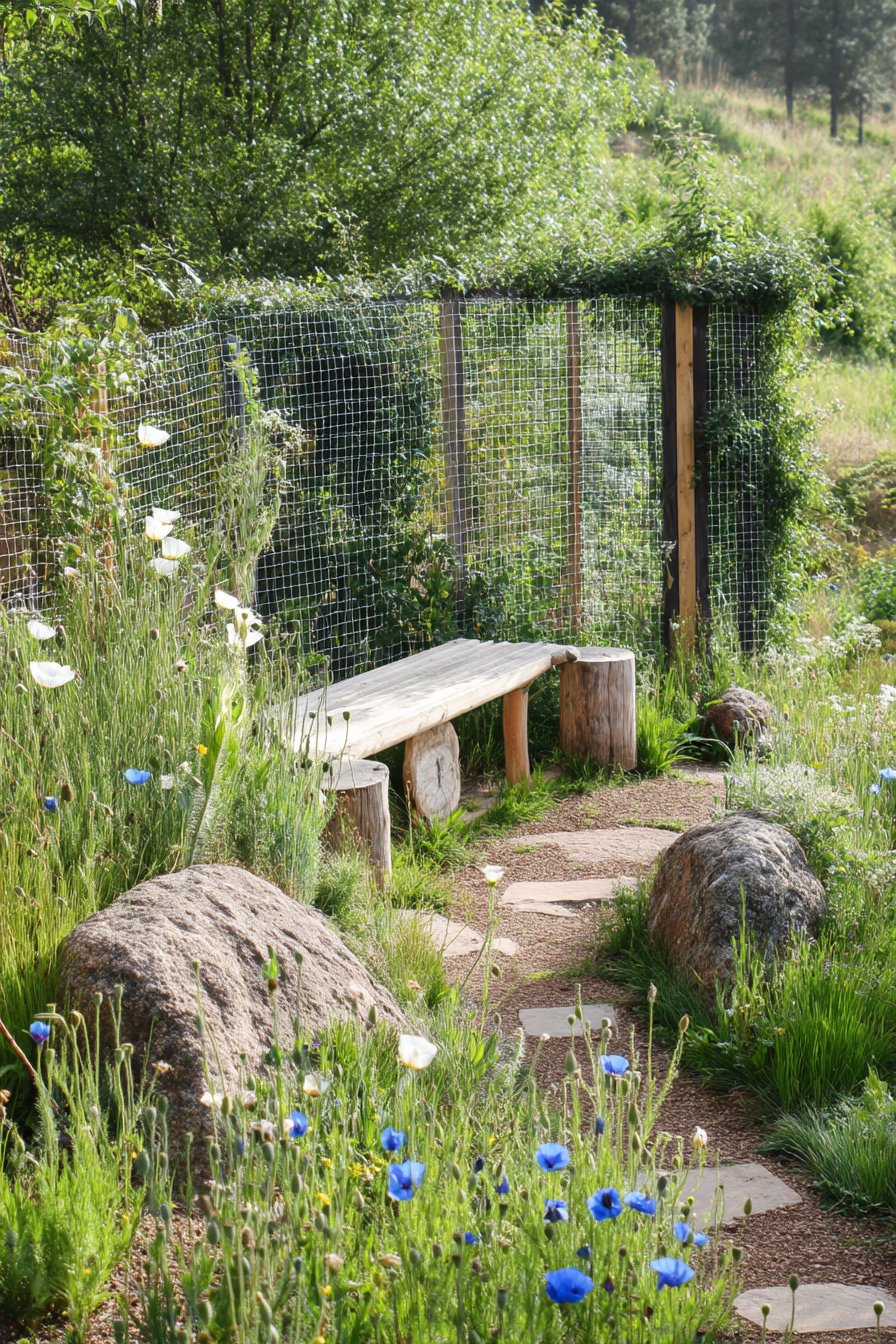 A rustic pathway meanders through a vibrant mix of wildflowers like cornflowers and poppies, creating a charming, natural look. Incorporate local stones and reclaimed wood for seating to enhance the organic feel while ensuring low maintenance.