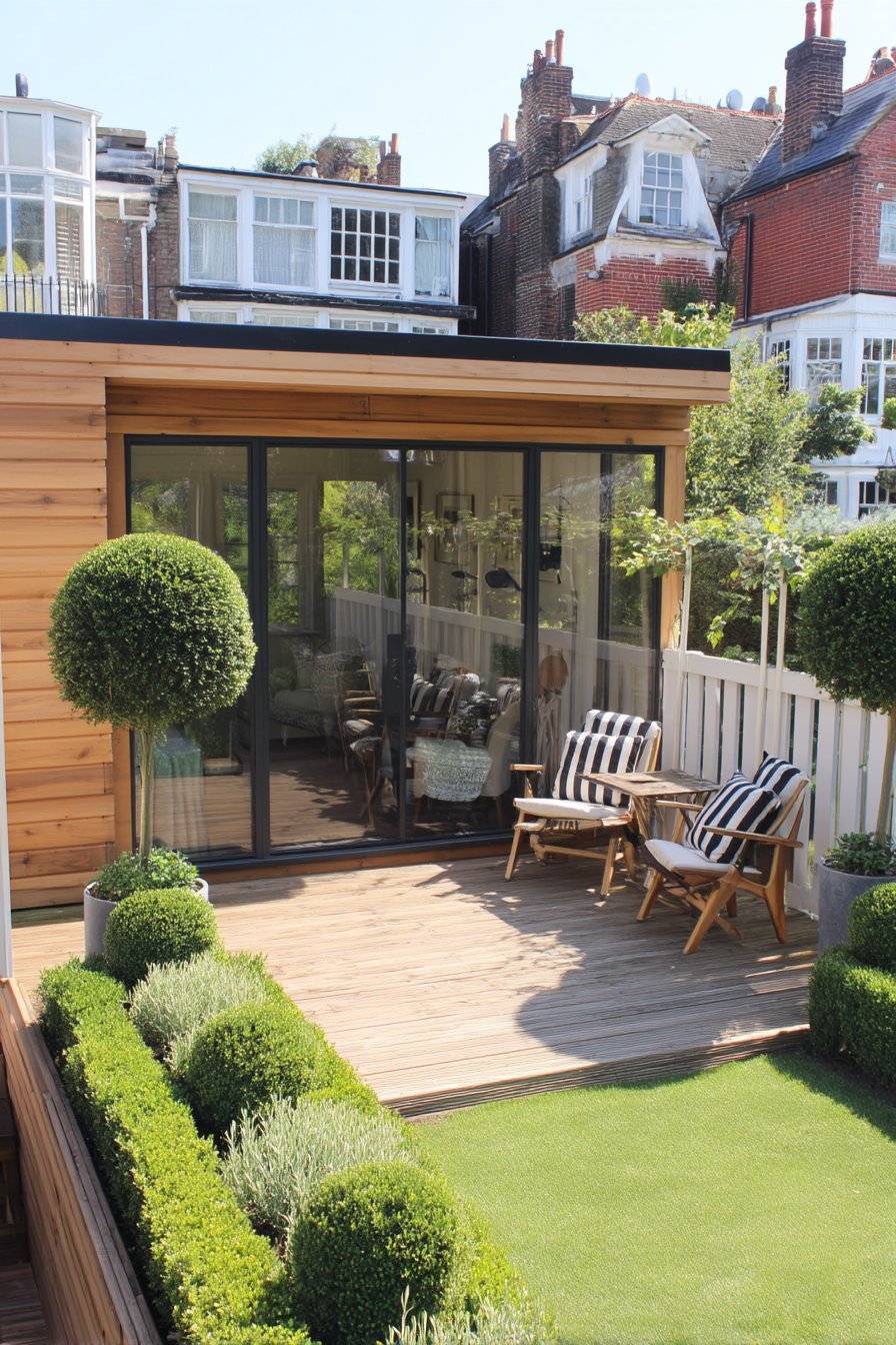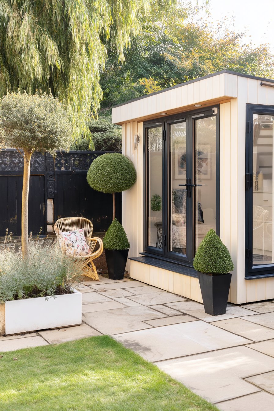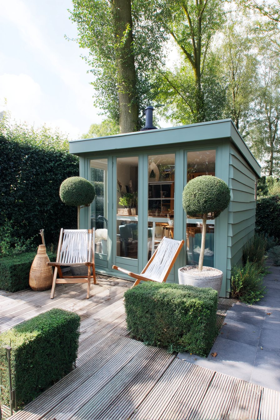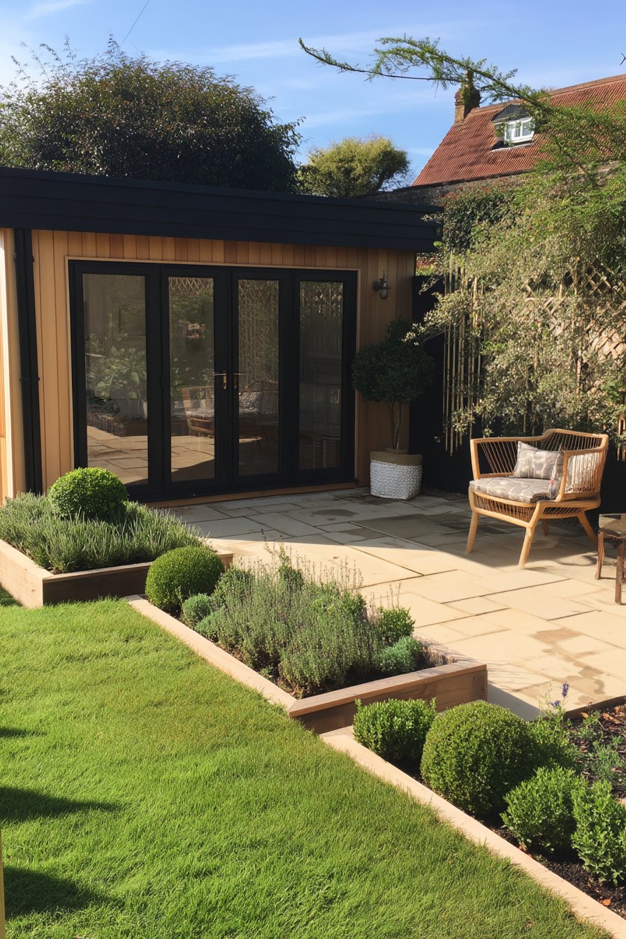 16) Modern Garden Office with Boxwood Borders