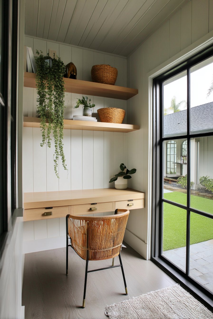 This design beautifully integrates trailing plants like string of pearls with sleek wooden shelves, creating a serene workspace. To replicate this look, choose low-maintenance greenery and pair them with natural materials for a calming atmosphere.