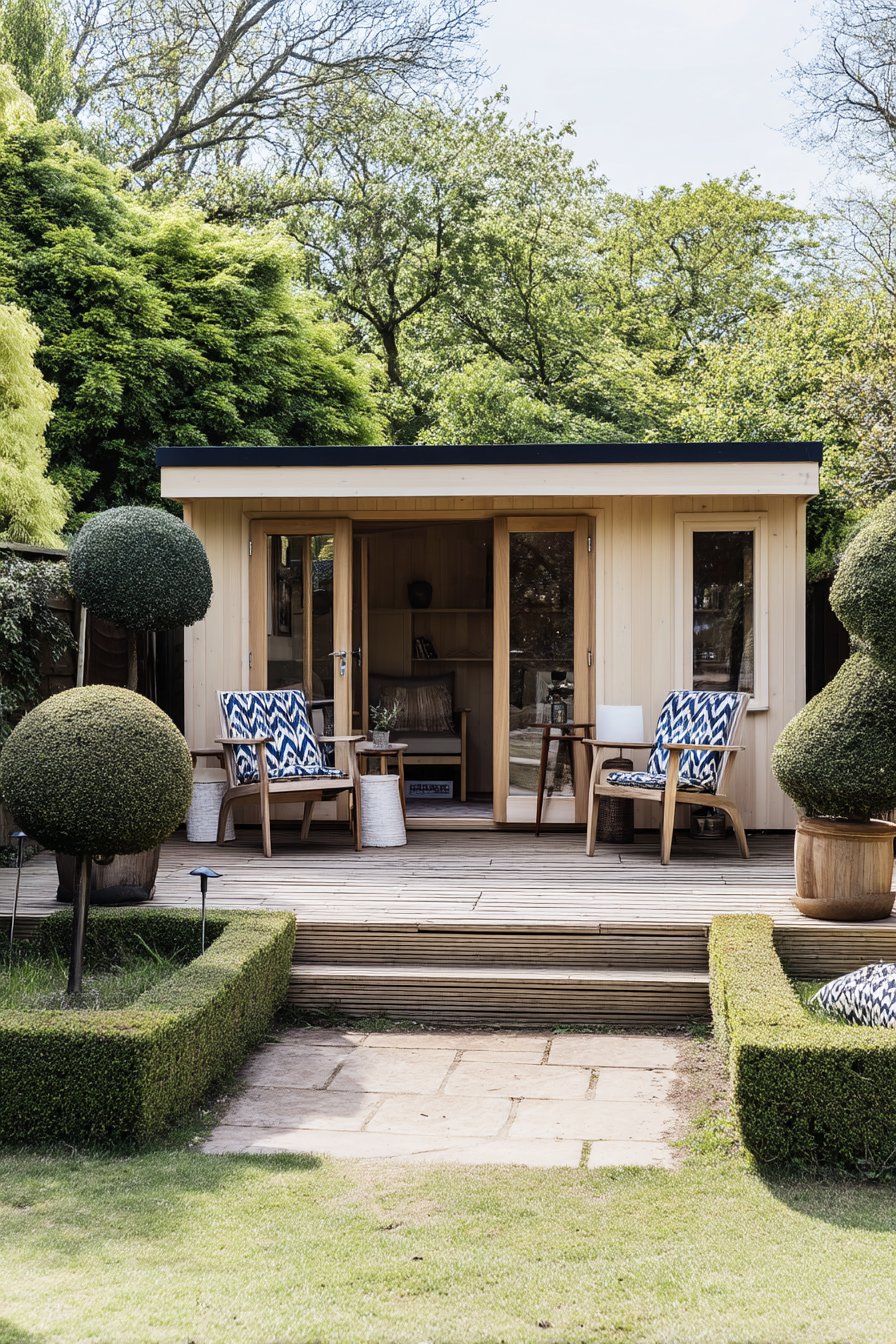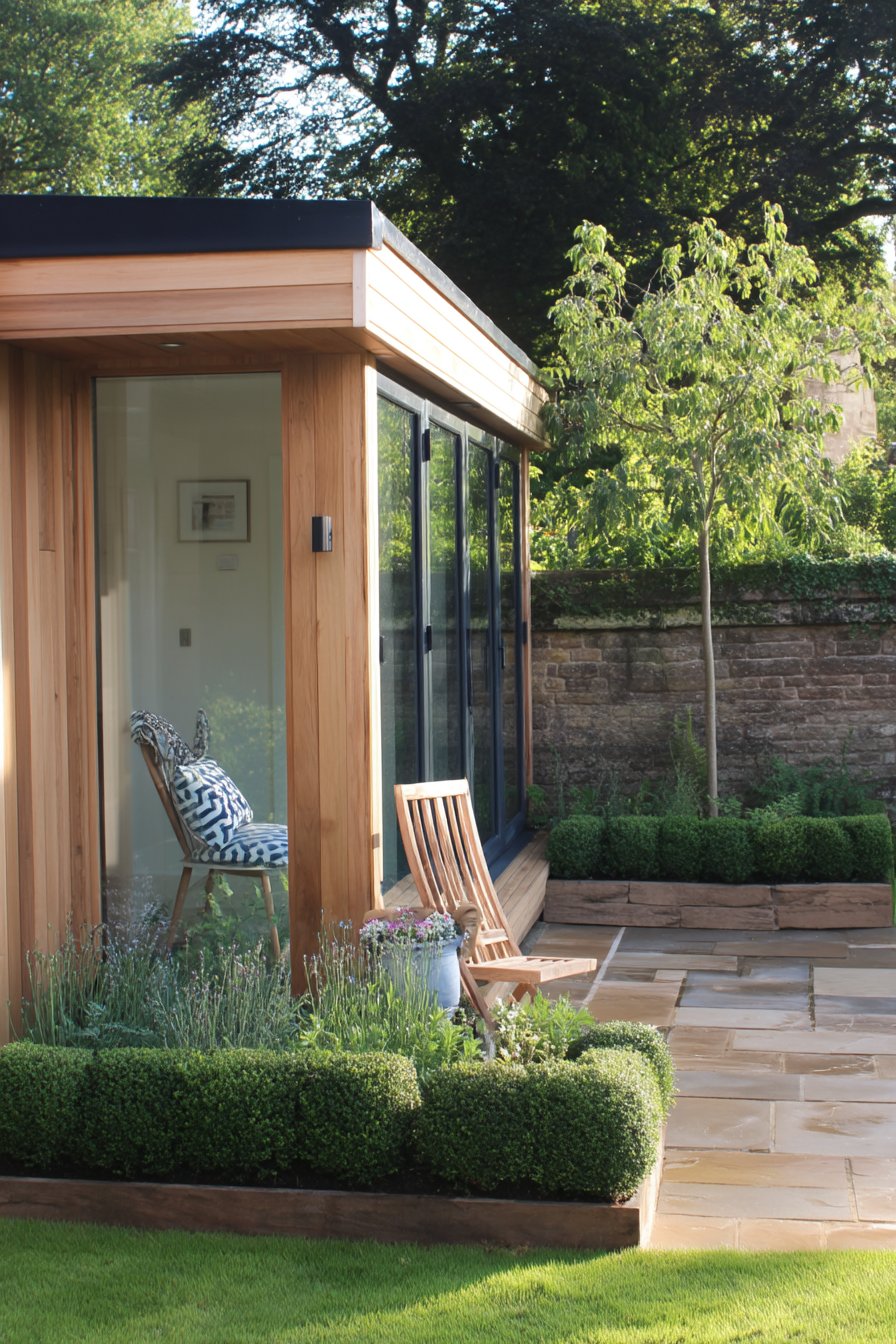 The sleek lines of boxwood borders create a sophisticated framework for this tranquil garden office, enhancing its modern aesthetic. Incorporating low-maintenance plants like ornamental grasses can add texture while complementing the clean, contemporary design.