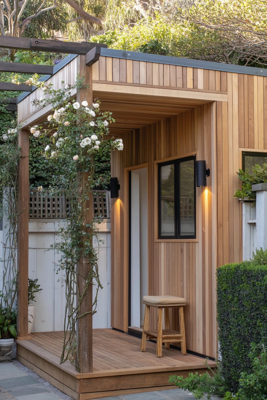 The combination of warm wooden textures and lush greenery creates a serene retreat, enhanced by climbing roses that add softness and fragrance. To replicate this look, consider using evergreens for structure and incorporating trellises for vertical planting, ensuring a harmonious blend of modern and rustic elements.