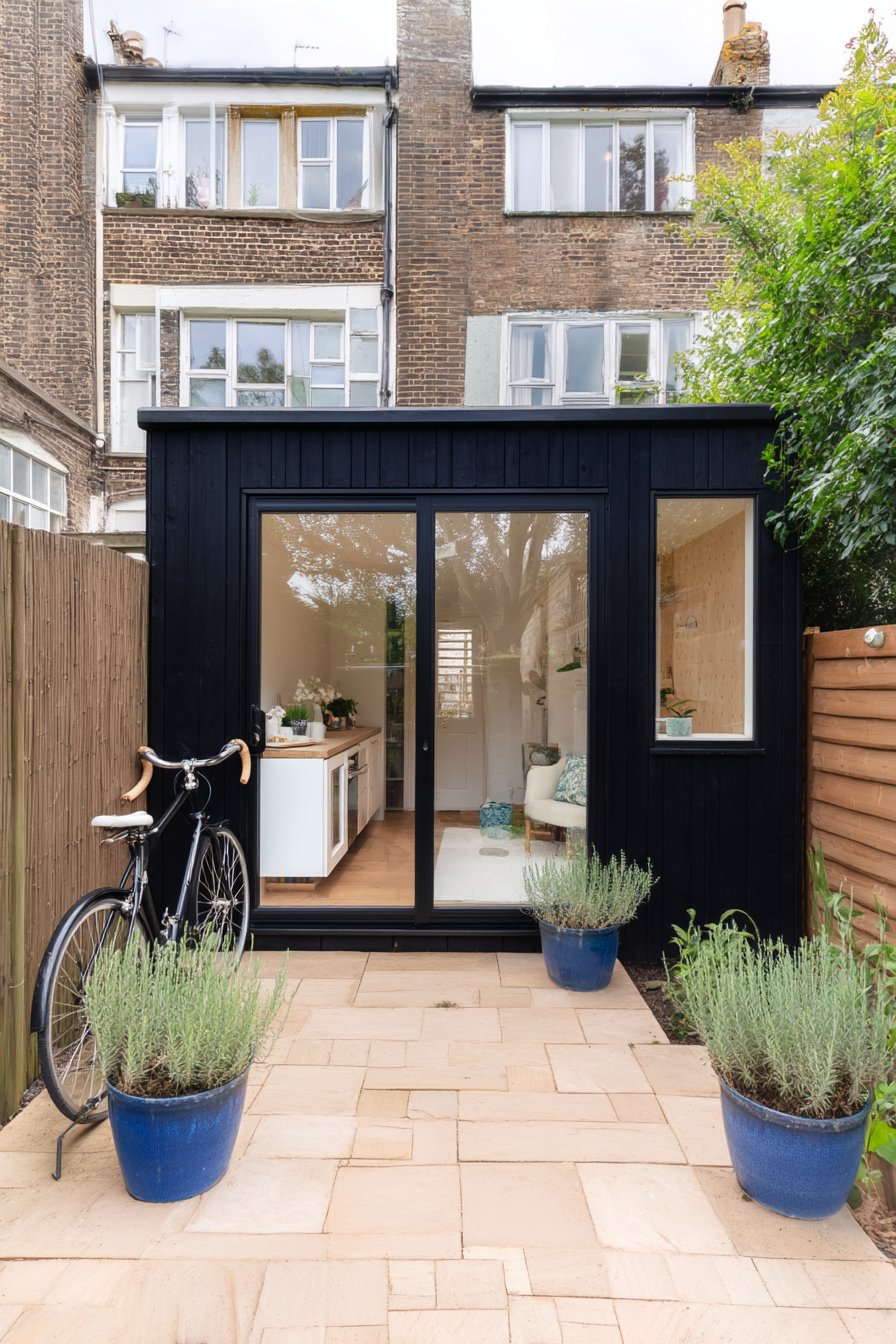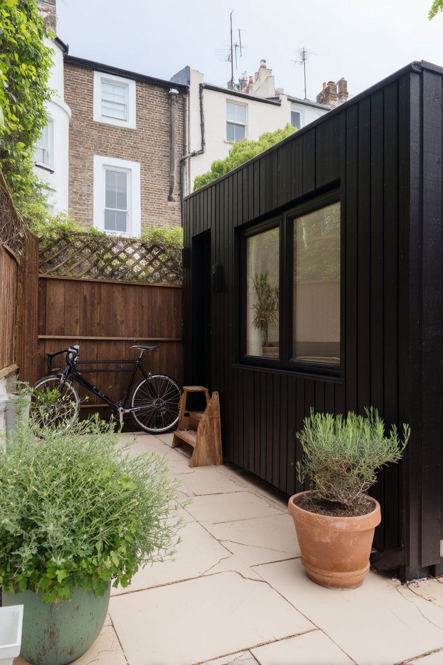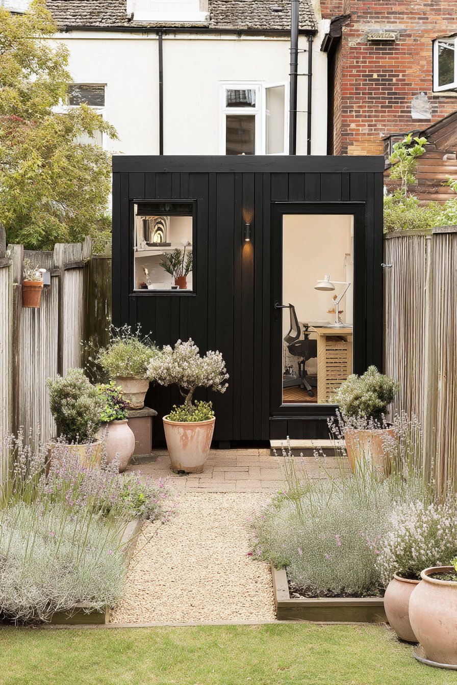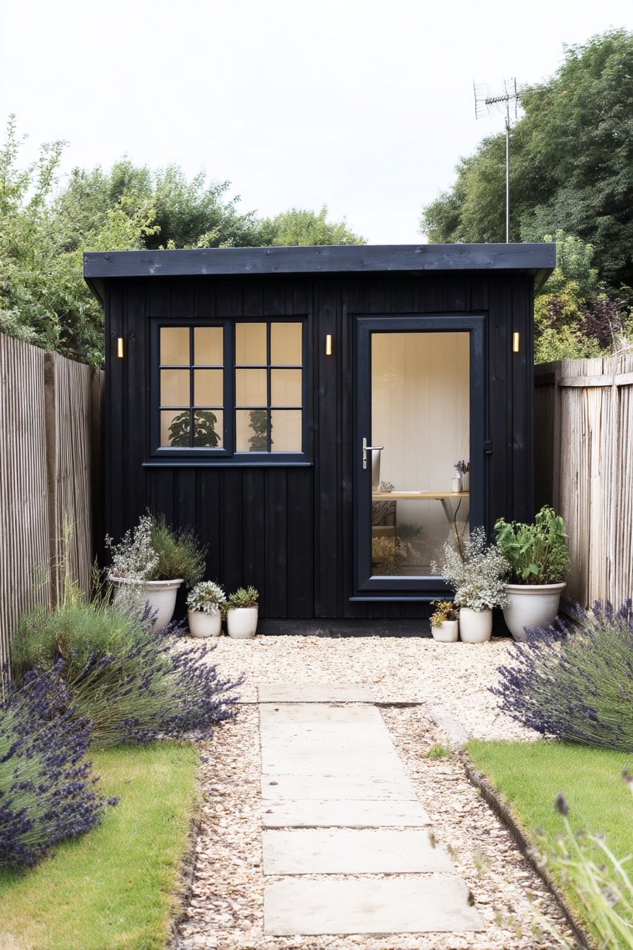 The sleek black shed beautifully contrasts with the vibrant lavender pathway, creating a striking focal point in any garden. To replicate this look, plant lavender along pathways for color and fragrance, and use simple white pots for a modern touch.