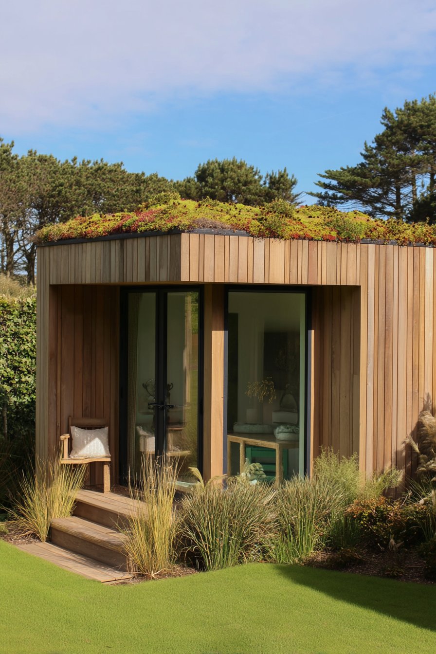 The vibrant green roof adorned with hardy succulents creates a stunning focal point, blending seamlessly with the natural surroundings. Incorporating native grasses and a cozy seating area can enhance your own outdoor oasis, offering both beauty and functionality.