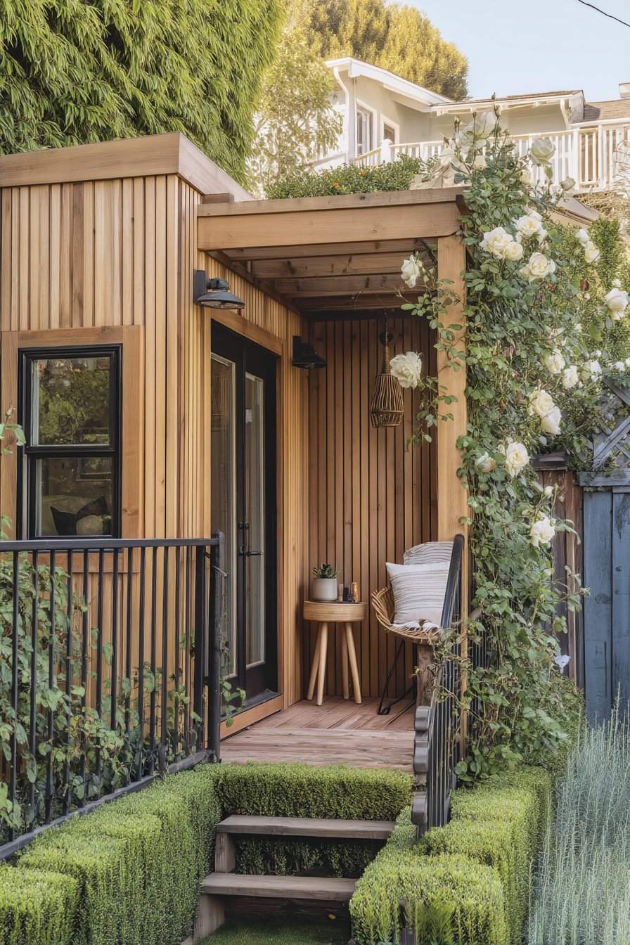 The elegant climbing add a romantic touch to the modern design, beautifully contrasting with the warm wooden textures. To replicate this look, consider using trellises for vertical gardening and choose low-maintenance plants that thrive in your local climate.