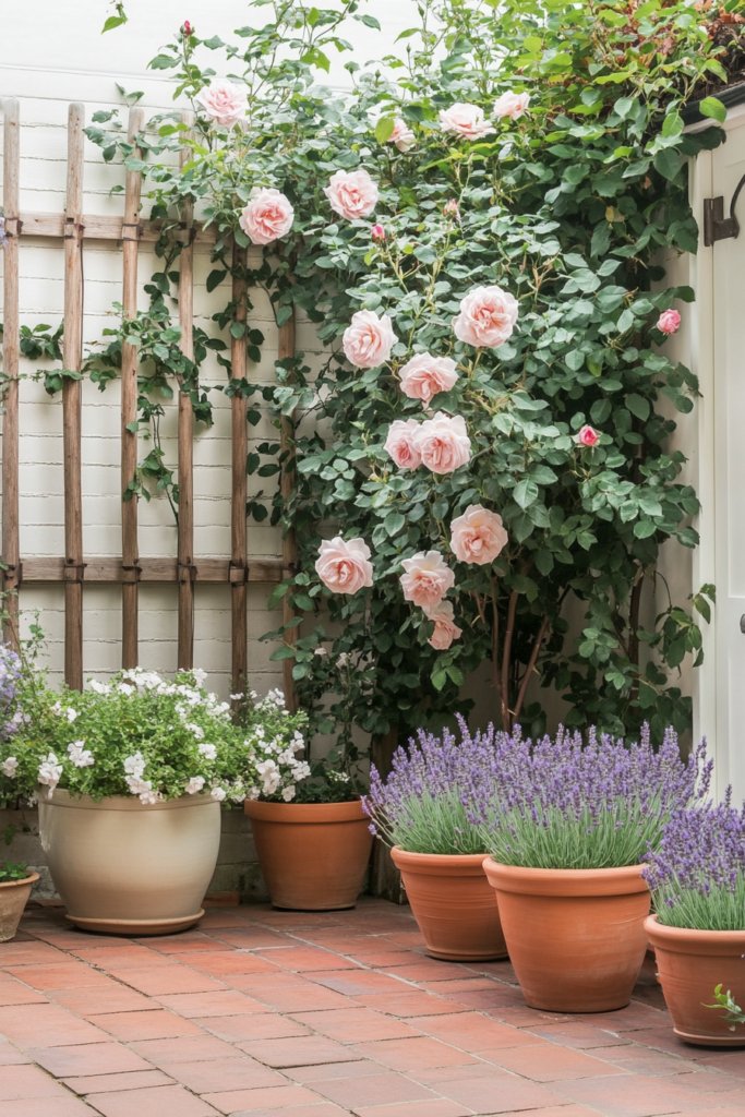 14. Quaint Brick Courtyard with Climbing Roses and Potted Lavender