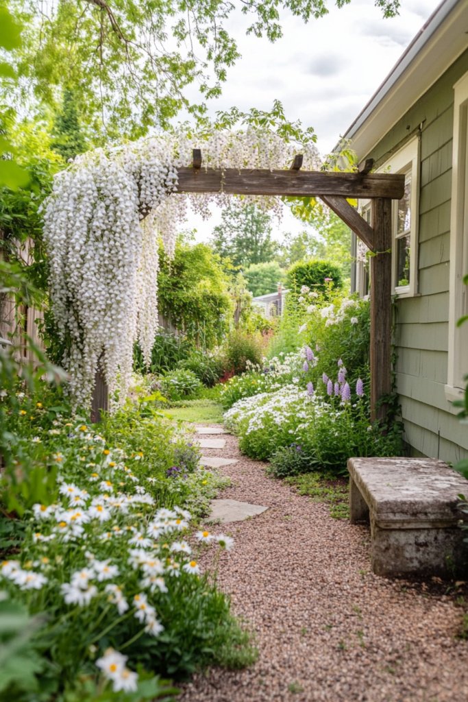 A small, enchanting garden with a rustic wooden arch draped in white wisteria. A compact flower bed overflows with daisies and foxgloves, while a weathered stone bench tucked in the corner offers a peaceful resting place.