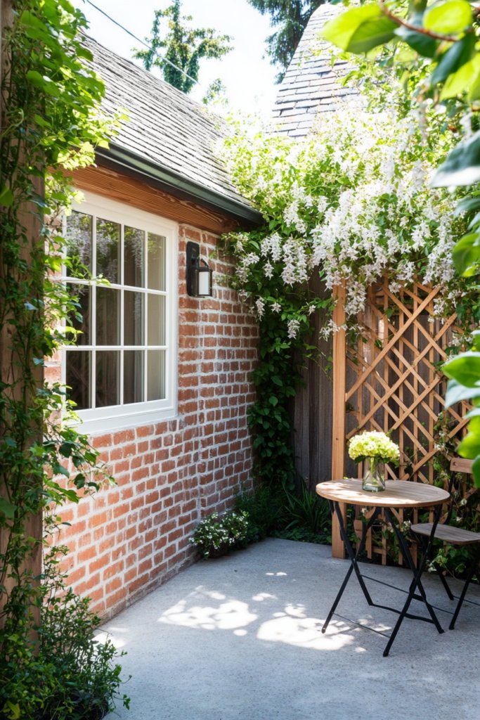 7. Hidden Cottage Courtyard with a Delicate Clematis Trellis