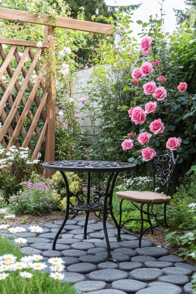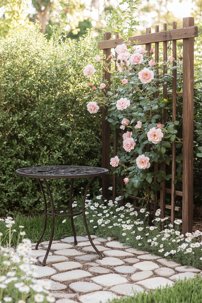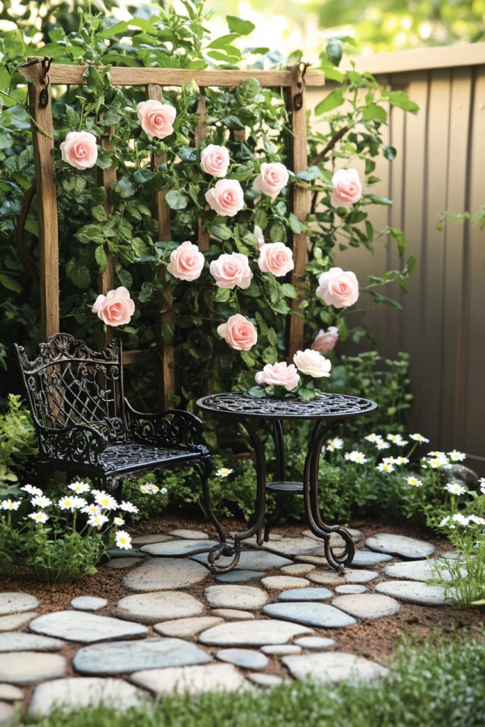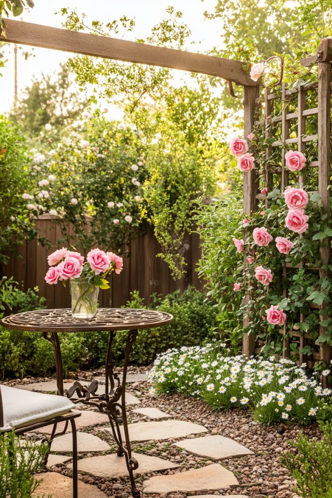 A tiny backyard escape featuring a vintage wrought-iron garden table, set beneath pink English roses climbing a wooden trellis. Wild daisies grow between cobblestones, adding a natural, whimsical touch. Enhance with antique-style lanterns and delicate lace tablecloths.