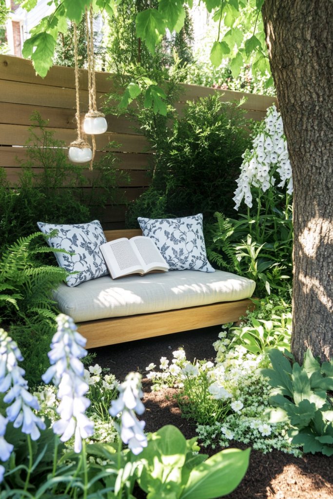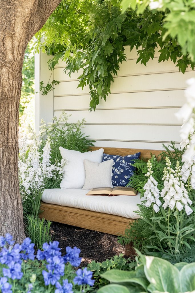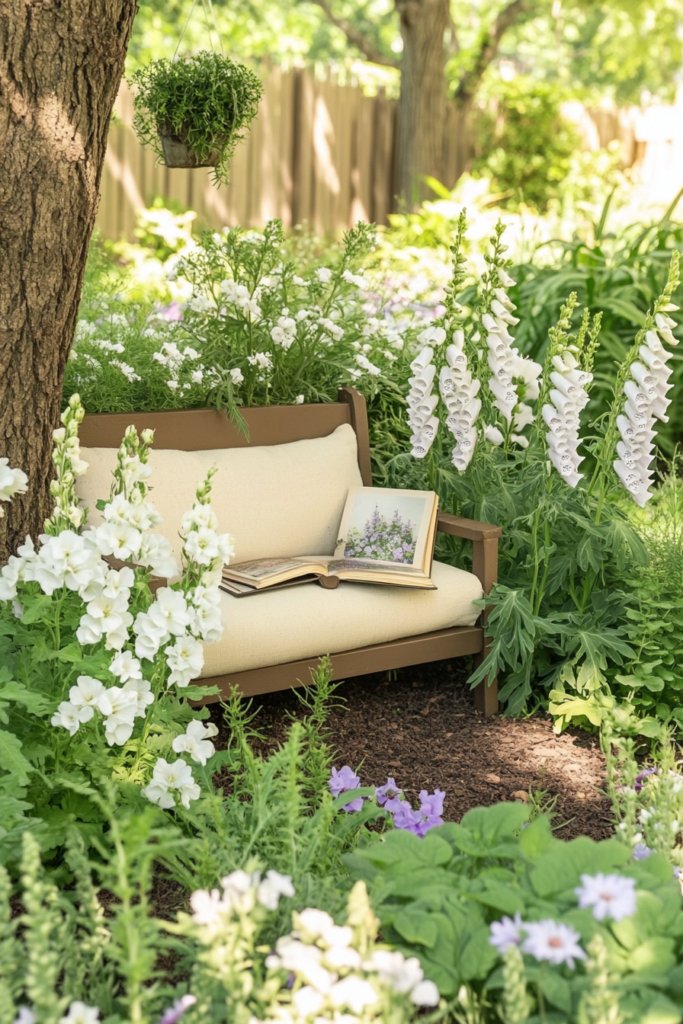 A small but dreamy garden retreat with a cushioned wooden bench nestled among soft delphiniums, ferns, and white foxgloves. The shade of an old tree adds to the peaceful atmosphere, while vintage garden books and a teacup complete the scene.