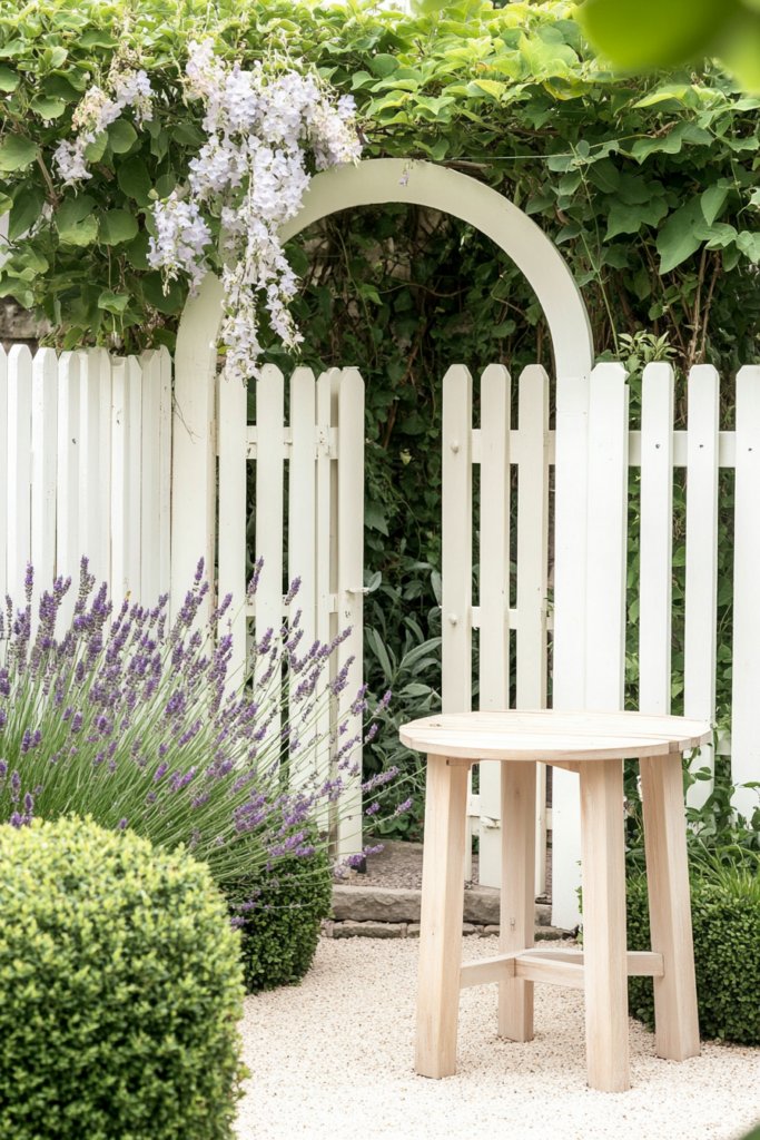A compact and cozy garden hidden behind a classic white picket fence. Fragrant lavender hedges, delicate climbing clematis, and a small wooden garden table create an inviting space for relaxation. Enhance the charm with weathered stone edging and hand-painted garden signs.