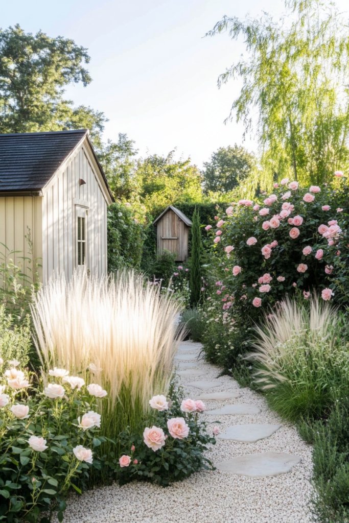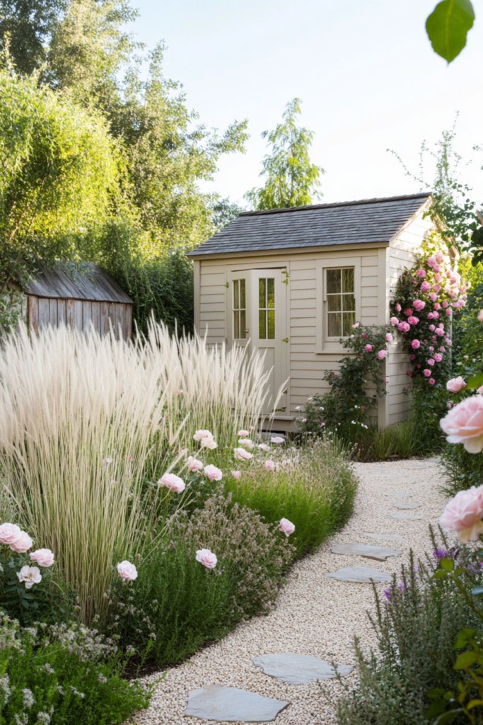A small yet lush space blending feathery ornamental grasses with blush pink climbing . A hidden stone pathway winds through the greenery, leading to a tiny rustic garden shed. Accentuate the charm with an old wooden bench, antique lanterns, and soft moss between the stepping stones.