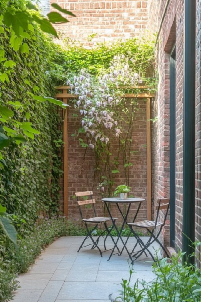 A secret retreat enclosed by ivy-covered brick walls, where a small wooden trellis overflows with delicate clematis vines. A tucked-away bistro table offers a quiet spot for morning coffee, surrounded by soft moss and vintage stone planters.