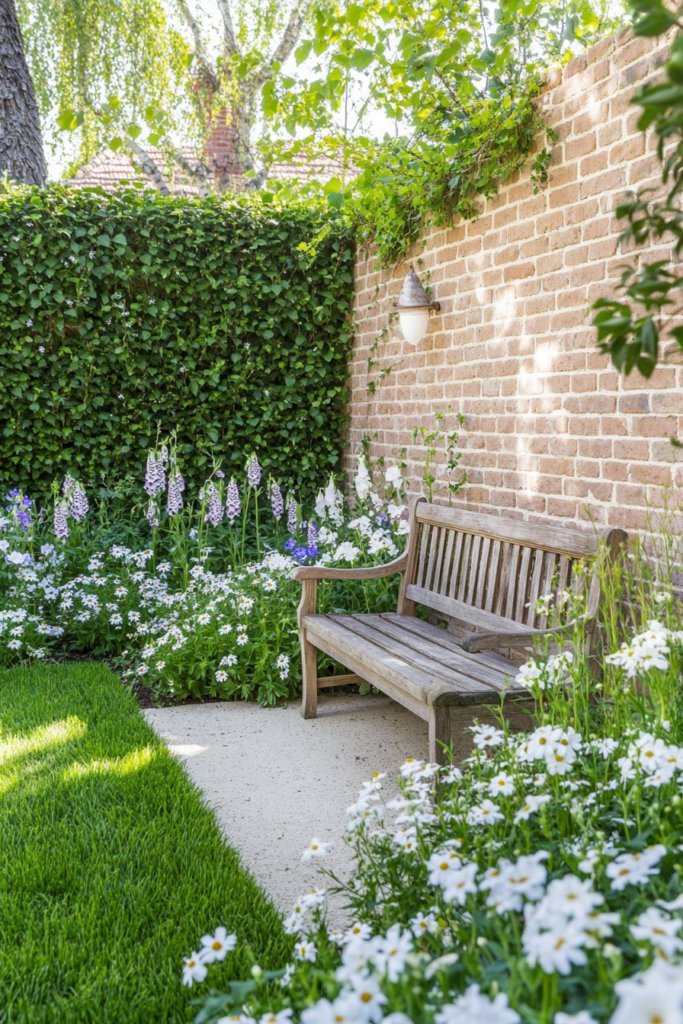 A small, enclosed garden with aged brick walls, where a cozy wooden bench sits beneath soft trailing ivy. Compact flower beds burst with foxgloves, daisies, and forget-me-nots, creating a secret-garden feel. Enhance with antique garden tools and delicate wrought-iron accents.