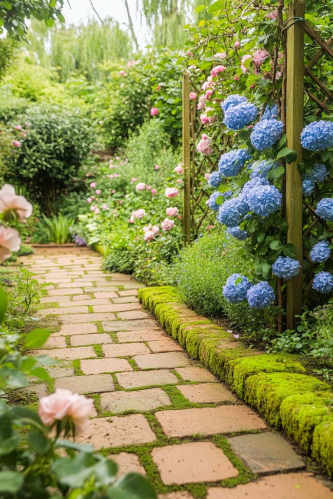 13. Petite English Garden with Mossy Brick Paths and Hydrangeas