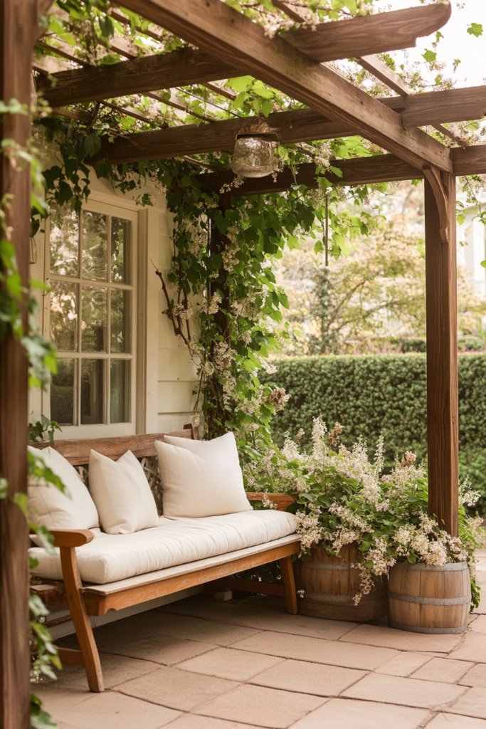 A charming small patio tucked beneath a wooden pergola covered in trailing ivy and fragrant honeysuckle. Soft cushions rest on a rustic wooden bench, creating a dreamy hideaway. Add twinkling fairy lights and delicate candle holders for an evening glow.