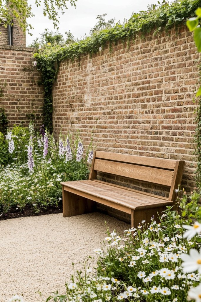 22. Tiny Walled Cottage Garden with a Rustic Wooden Bench