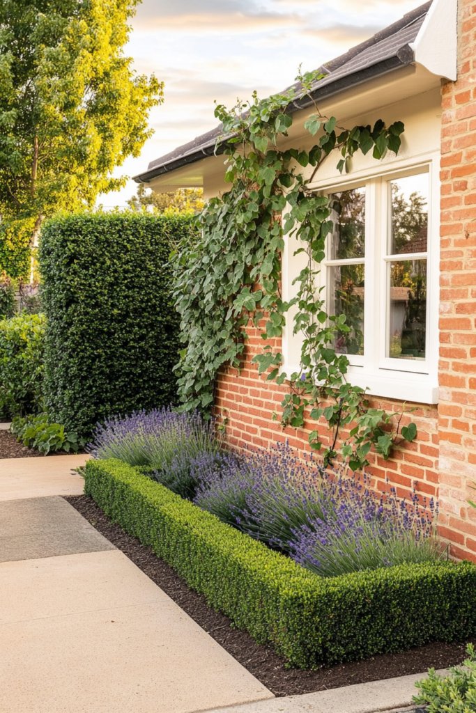 A welcoming front garden where a neatly trimmed boxwood hedge lines the pathway, leading to a red brick wall adorned with climbing ivy. Small lavender bushes add fragrance to the air, creating a classic English cottage charm. Complete the scene with a cast-iron gate and a hanging flower basket.