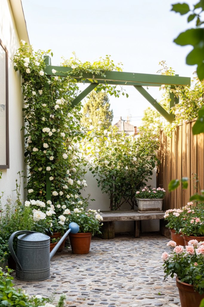 4. Cottage Courtyard with a Lush Green Trellis and Potted Flowers