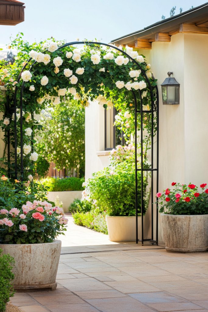 17. Secret Courtyard Garden with a Wrought Iron Arch and Potted Roses