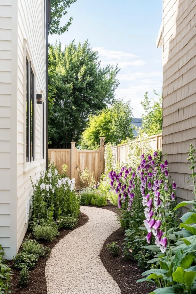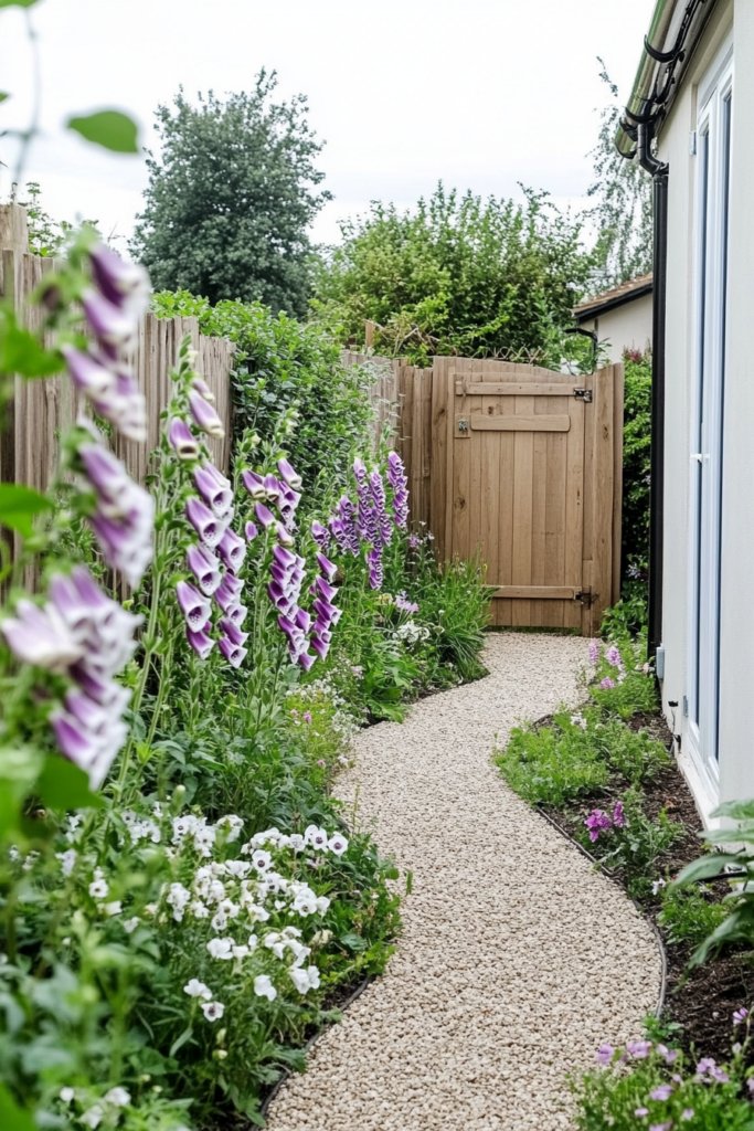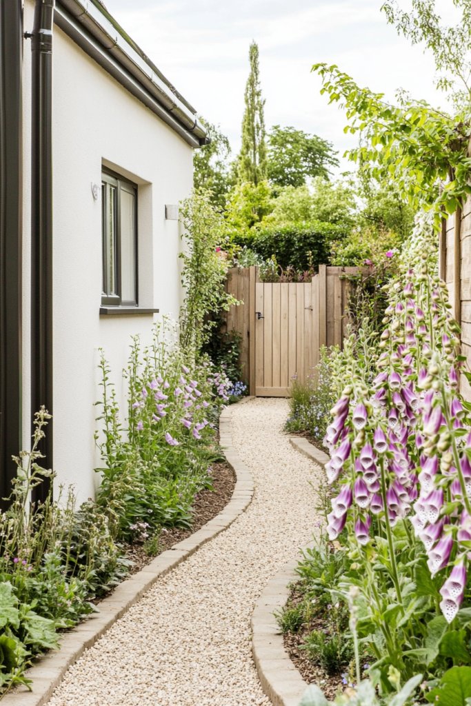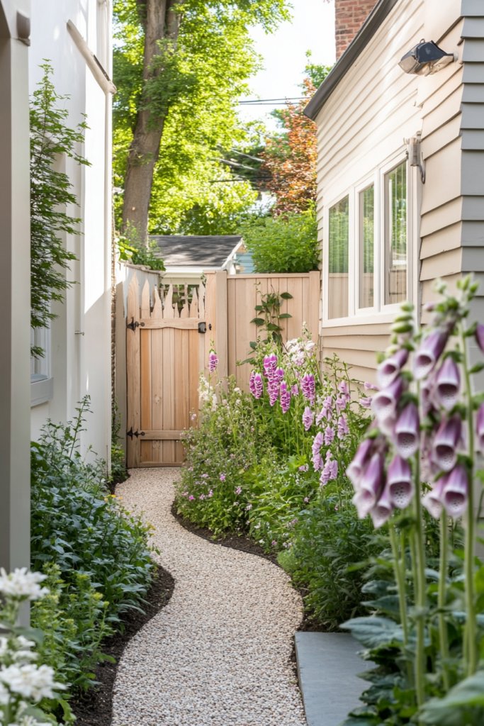 A narrow side garden transformed into a charming cottage retreat, where a winding gravel path is lined with clusters of foxgloves and daisies. A tiny wooden gate at the end leads to the back patio, while vintage stepping stones add to the secret-garden feel.