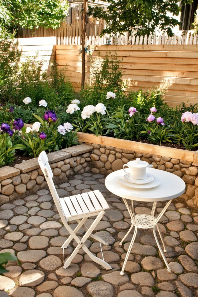 A tiny backyard retreat featuring a cozy cobblestone patio framed by raised flower beds bursting with and violets. A white-painted bistro table sits perfectly for morning tea, surrounded by soft ivy and delicate fairy lights. Enhance the charm with vintage watering cans and rustic stone edging.