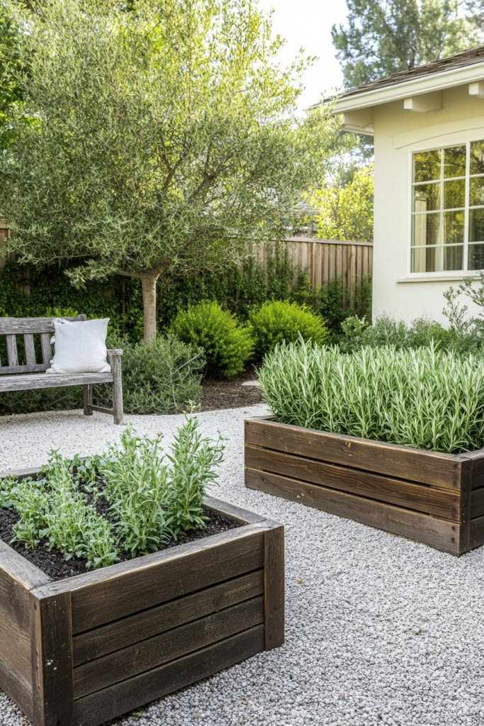 A cozy, low-maintenance cottage garden featuring a gravel patio bordered by wooden raised herb beds overflowing with rosemary, thyme, and chives. A weathered garden bench invites peaceful moments among the fragrant greenery.