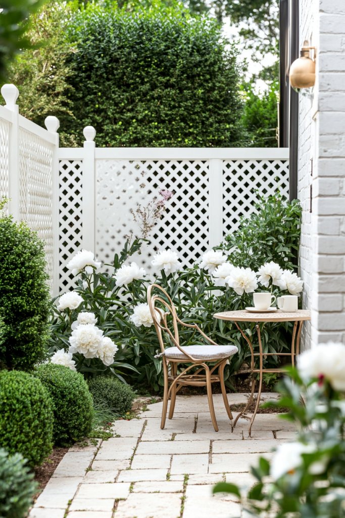 8. Micro Cottage Garden with a Small Lattice Fence and White Peonies