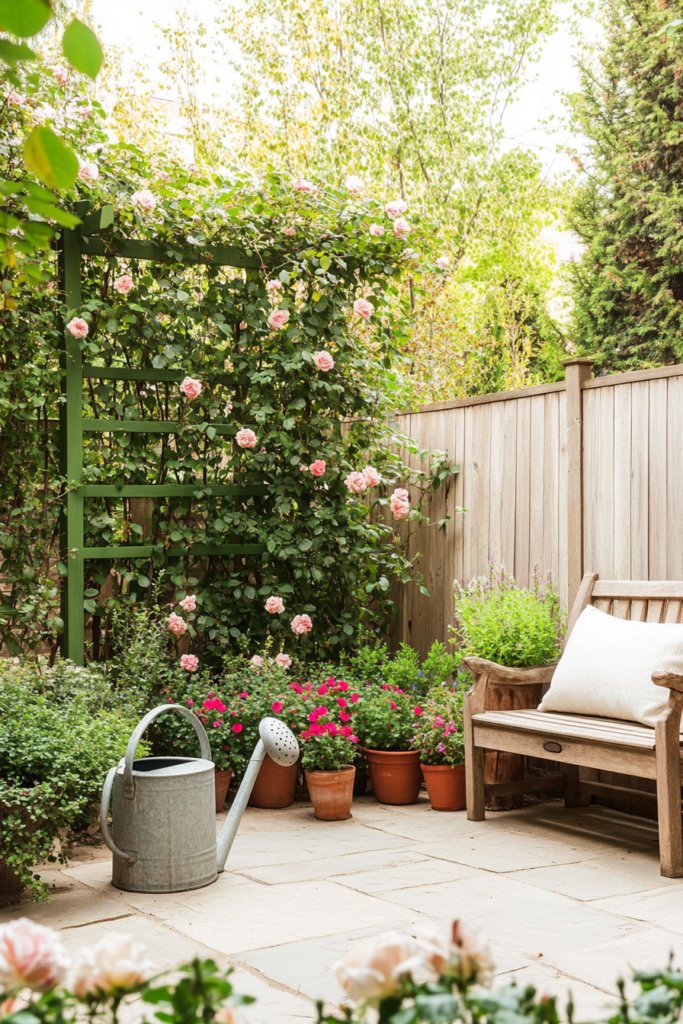 A lush courtyard garden featuring a wooden trellis draped in climbing roses, surrounding a quaint stone patio. Potted geraniums and a vintage watering can rest beside a wooden bench, offering a cozy and inviting escape. Enhance with wrought-iron lanterns and scattered wildflowers.