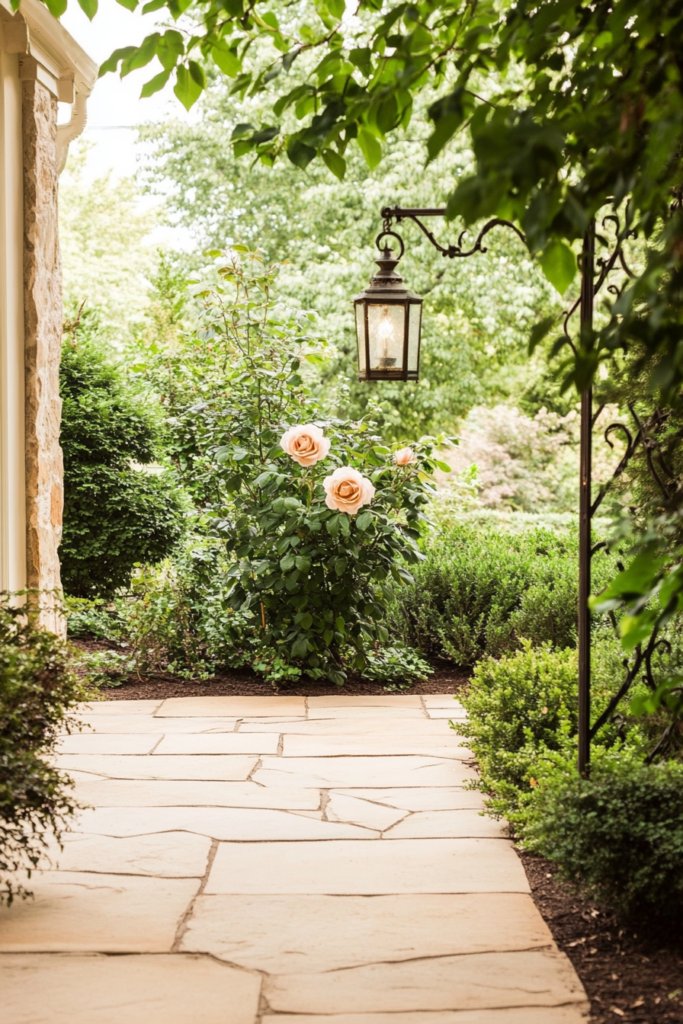 12. Paved Cottage Patio with a Central Rose Bush and Vintage Lanterns