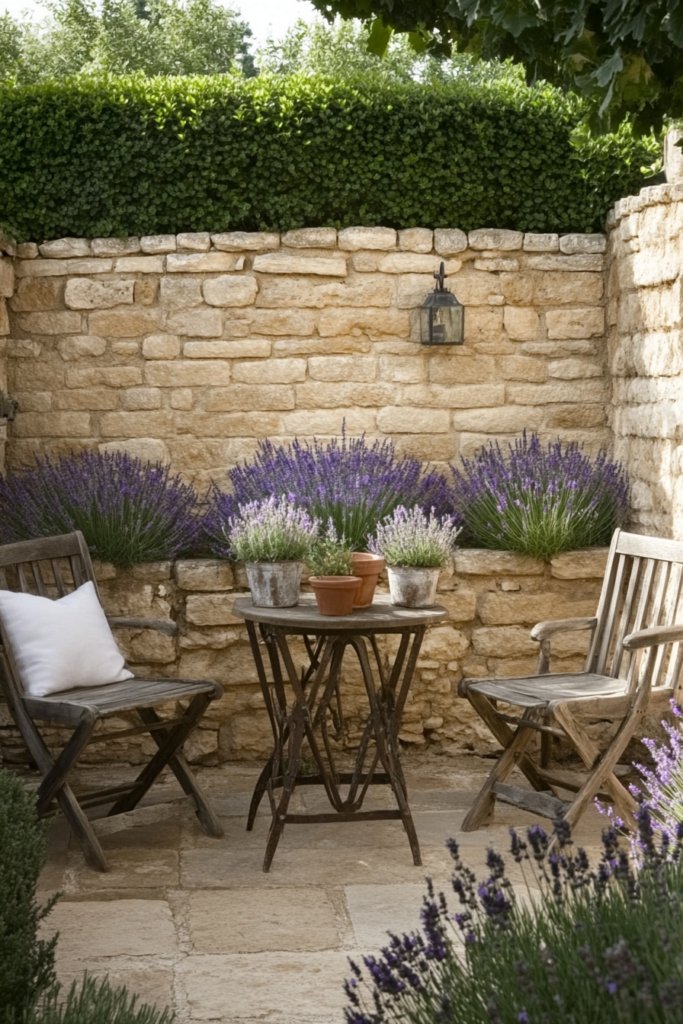 21. Tiny Patio Garden with Rustic Stone Walls and Lavender Borders
