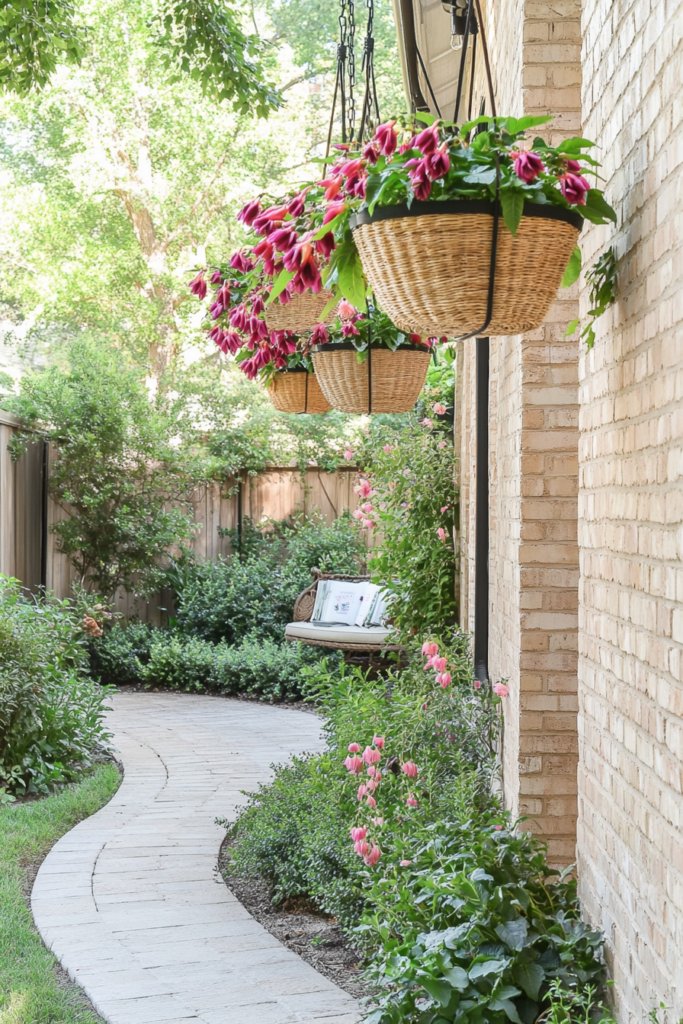 20. Tiny Brick-Walled Garden with Overflowing Hanging Baskets