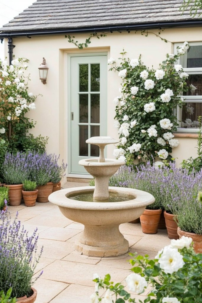 A classic British courtyard centered around an elegant stone fountain, surrounded by lavender, white climbing roses, and rustic terracotta pots brimming with thyme and rosemary. A small wrought-iron bench provides the perfect place to soak in the beauty.