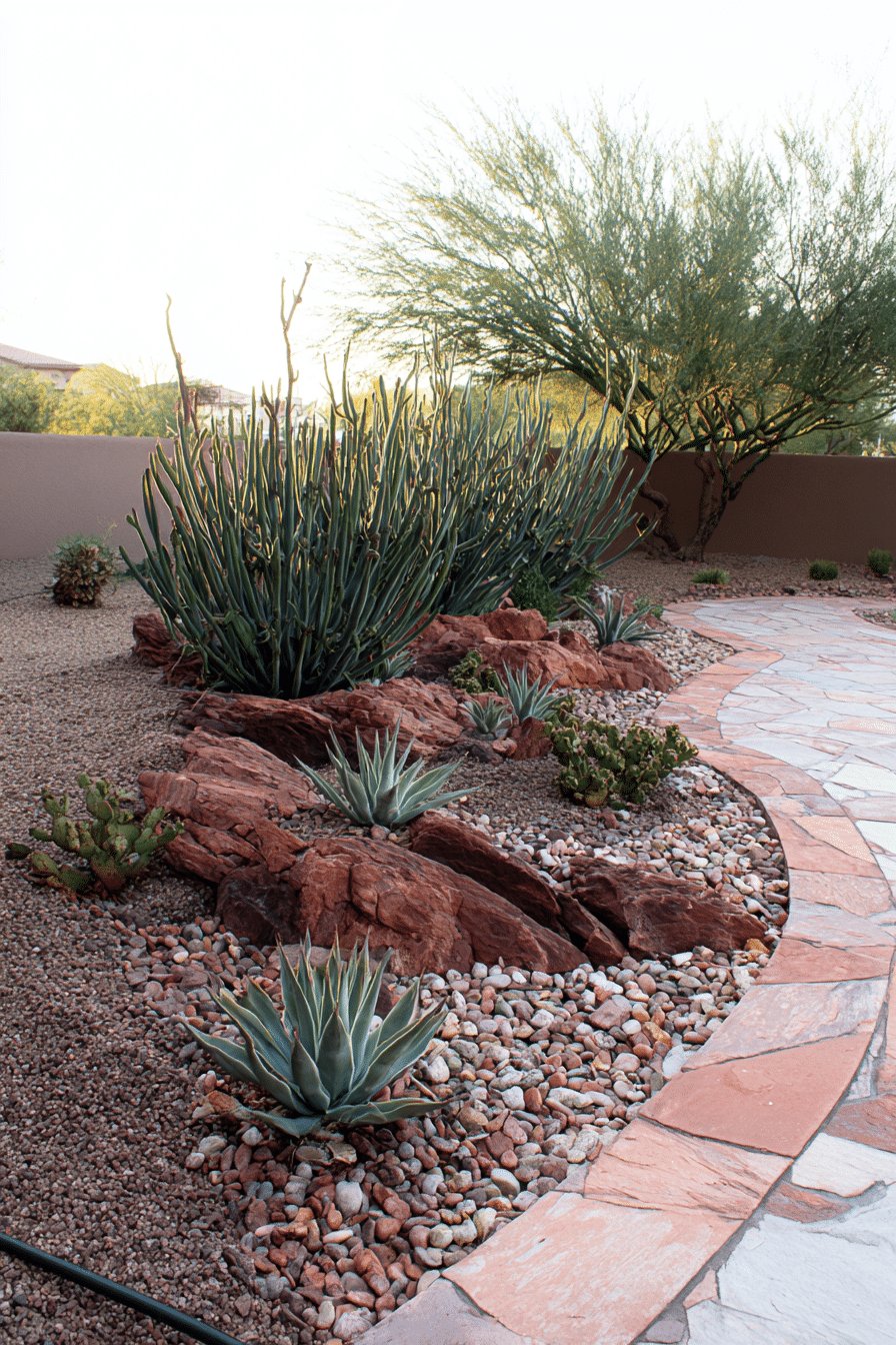 I love how this backyard reads like a desert still life. Red sandstone rocks anchor the beds, blue-gray agaves pop against warm gravel, and upright, finger-like succulents add vertical drama.