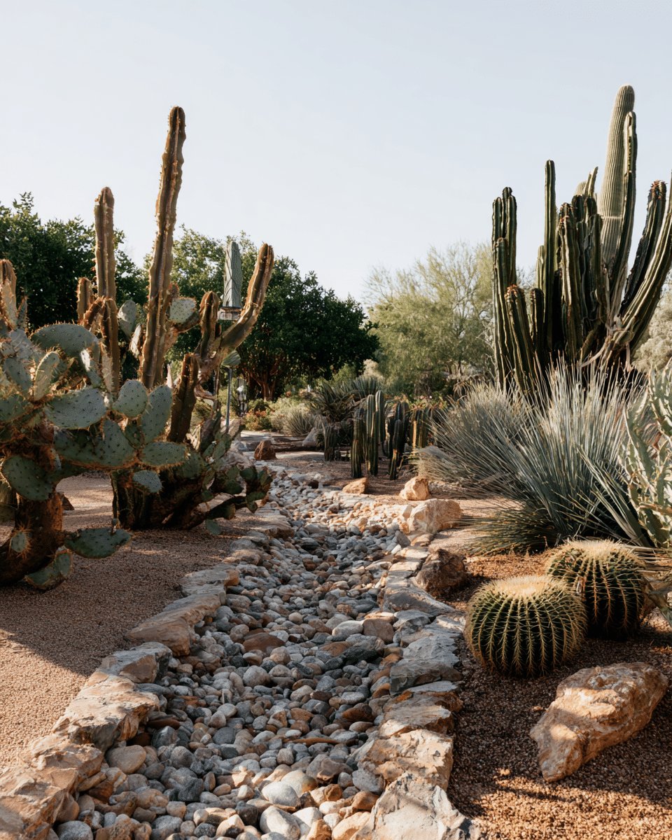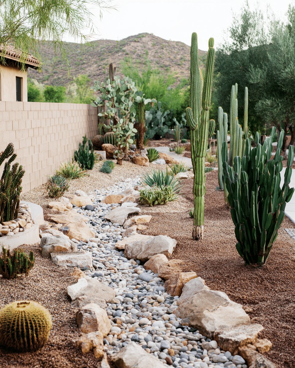 I love the calm, sculptural energy of this desert backyard. The dry riverbed of smooth pebbles threaded between boulders feels deliberate but relaxed, and the mix of tall columnar cacti, prickly pear pads, agave and a lone golden barrel gives the space real personality without fuss.