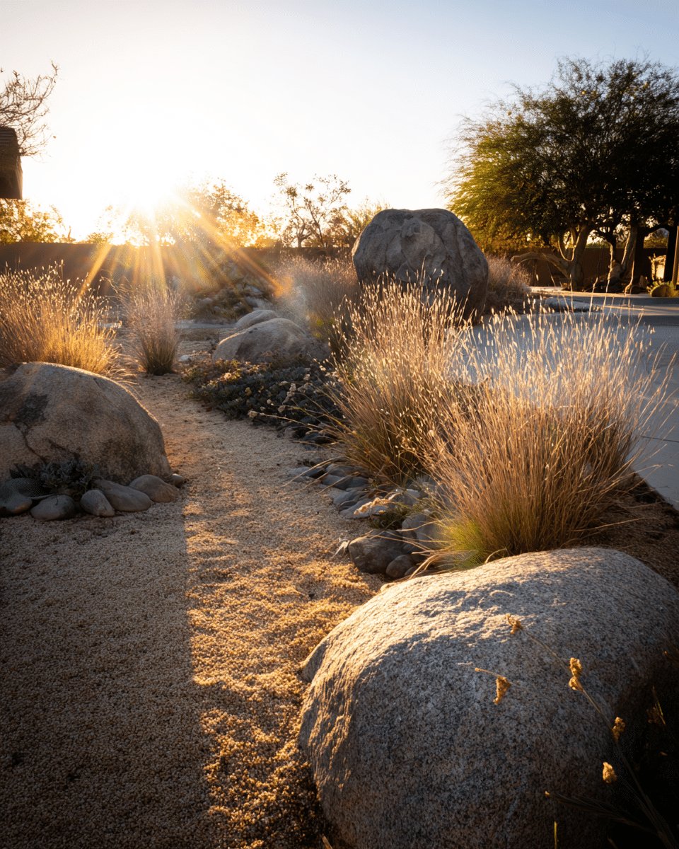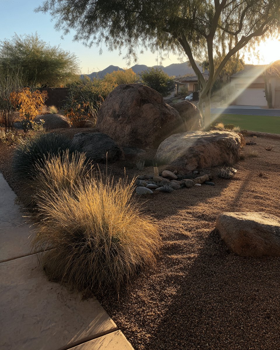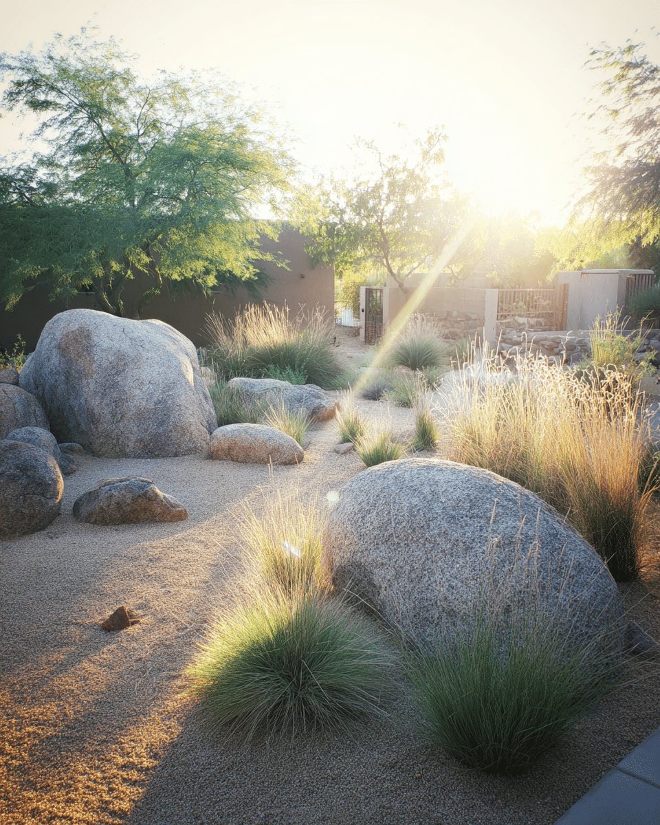 I love how this backyard does drama without trying. Big boulders sit like sculptures, gravel and a low rock bed keep the ground honest, and clumps of golden grasses catch the late sun so the whole scene looks like it’s quietly glowing.