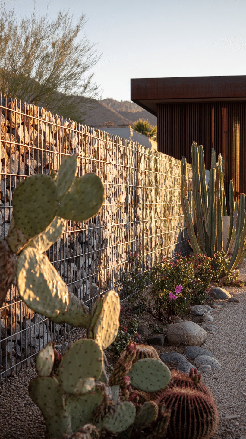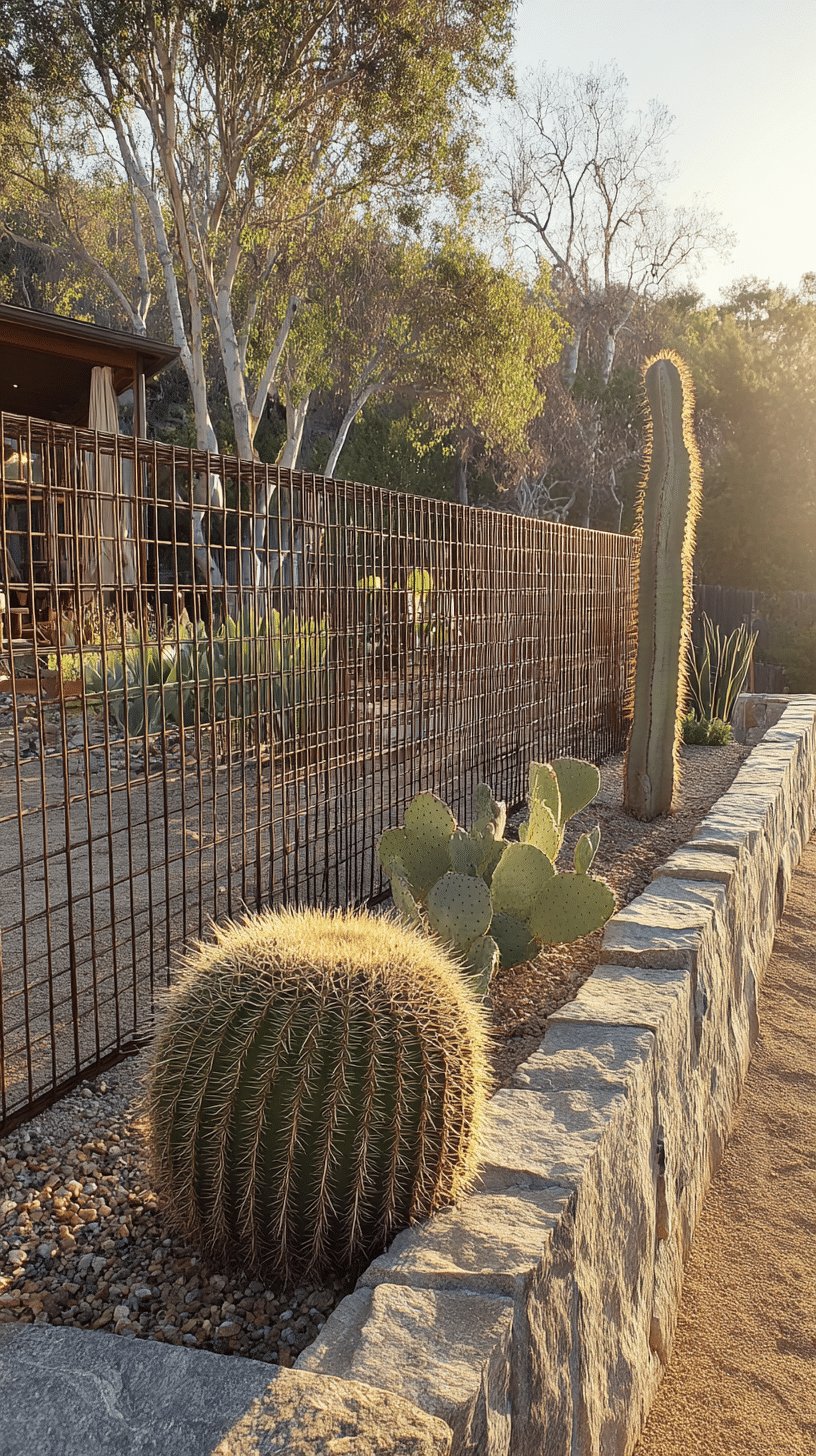 I love how this backyard reads like a calm, sculptural desert scene. The low stone wall and gravel bed keep everything neat while letting each cactus play its part: a round golden barrel, flat prickly pear pads, and a tall columnar silhouette that catches the light.
