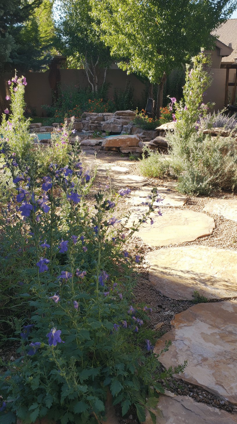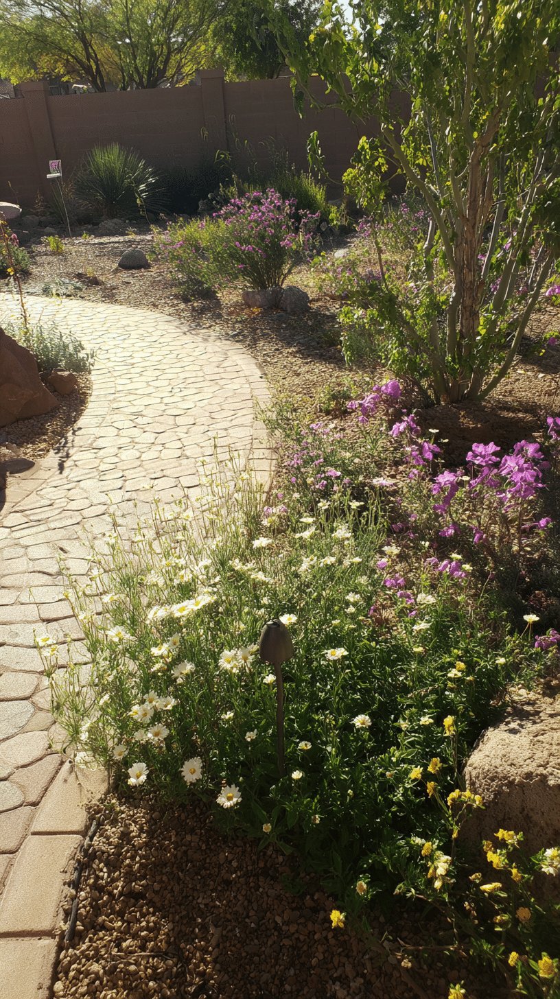 I love the calm, sun-warmed flow of this desert backyard. The curving paver path and gravel beds read like a low-effort masterpiece, while boulders, native shrubs and spiky grasses give it sculptural texture. Little bursts of white and purple blooms feel like confetti—cheerful, drought friendly, and forgiving of my sometimes-forgetful watering habits.