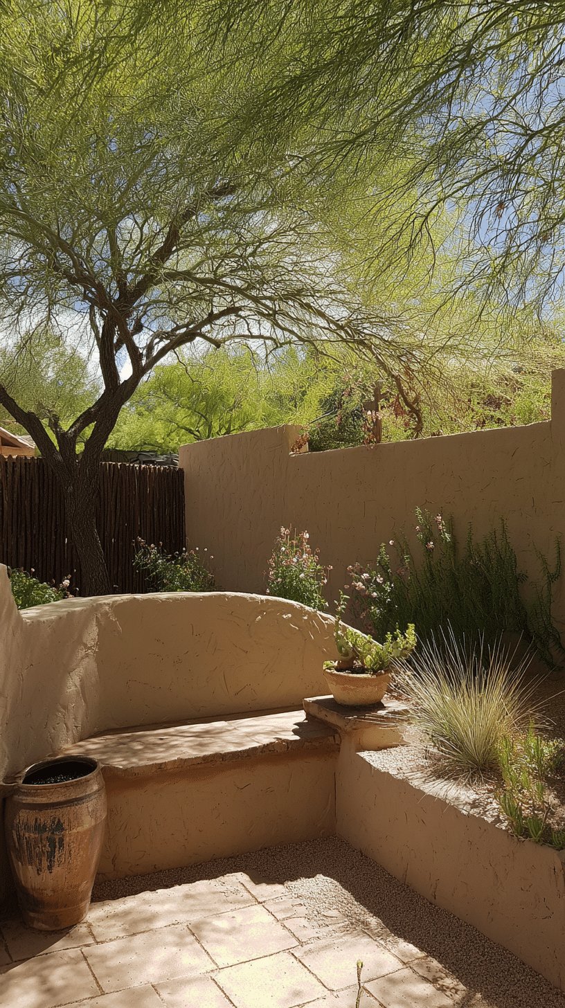 I’d style it with a couple of low benches or concrete stools and a woven throw for instant cozy, no-fuss seating. Add terracotta planters with a mix of succulents and a big agave for repeat rhythm, plus a few lanterns or string lights in the tree for soft evenings.