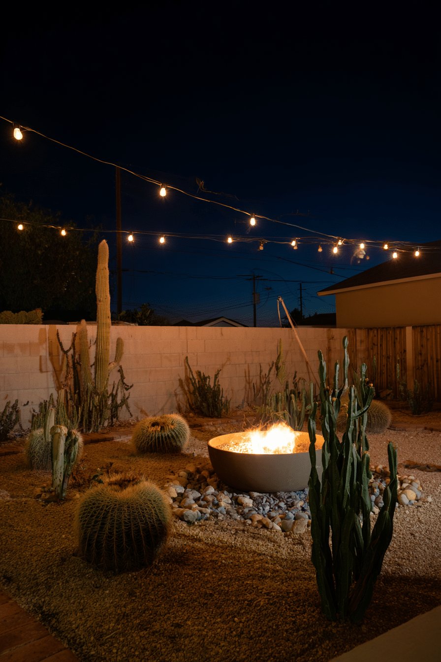 A shallow fire bowl becomes the room’s focal point, throwing cozy light up into the string bulbs above and turning the simple block wall and wooden fence into a moody backdrop. It reads like desert calm with personality, not a museum exhibit.