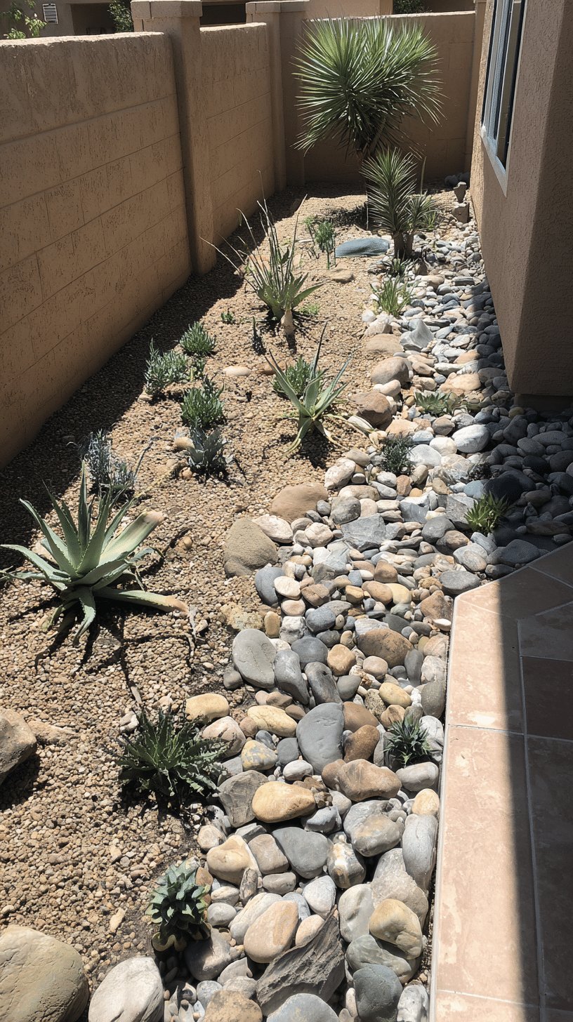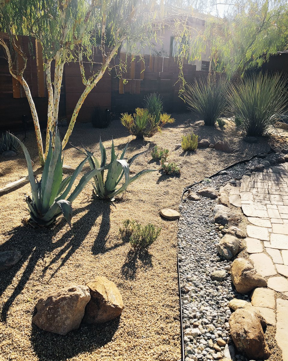 I love how this narrow backyard reads calm and intentional instead of cramped. A dry riverbed of smooth stones snakes beside a bed of pea gravel, giving the space movement and contrast, while sculptural agaves and a tall yucca anchor the composition.