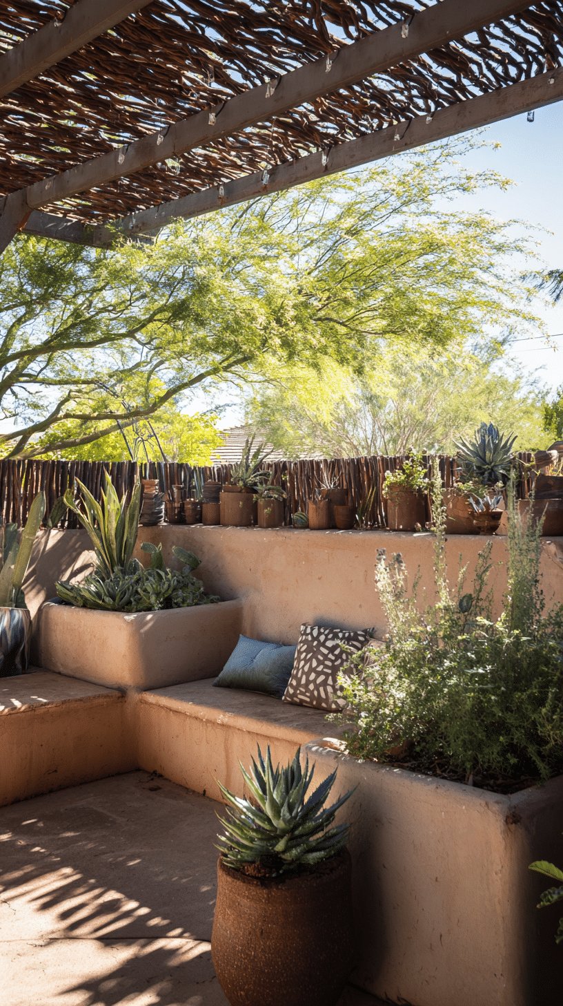I love the sun-baked stucco benches with built-in planters; they read like one-piece furniture that belongs outdoors. The layered succulents, agaves and potted cuttings along the ledge feel deliberate but chill, and the woven pergola filters light into pretty shadows.