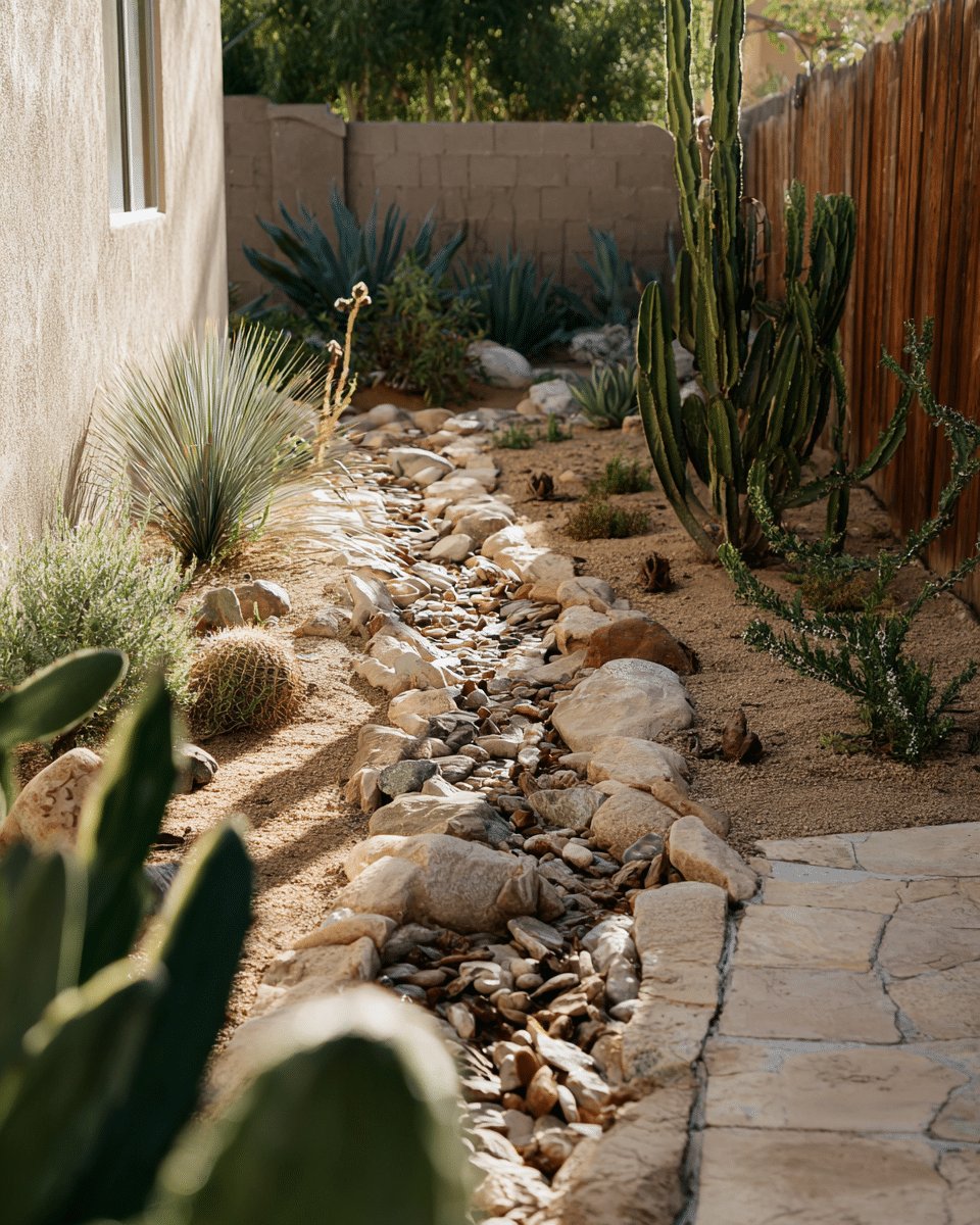 I love the effortless drama of this desert backyard. A meandering dry creek bed of river rock cuts through warm gravel, while tall columnar cacti stand like sentinels and rounded barrel cacti bring cheeky contrast. Clusters of agave and spiky grasses add sculptural texture and the sun-bleached palette keeps everything calm and low-maintenance.