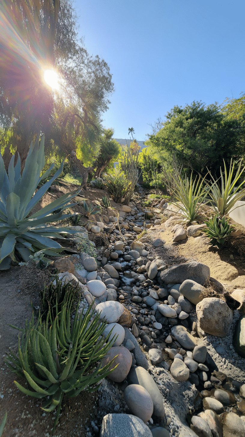 I love the sculptural drama of the large agave anchoring the slope and the way a dry creek bed winds through the space. Smooth river rocks and boulders read natural, not staged, and the mix of spiky yuccas, low succulents, and soft shady trees keeps the palette balanced.